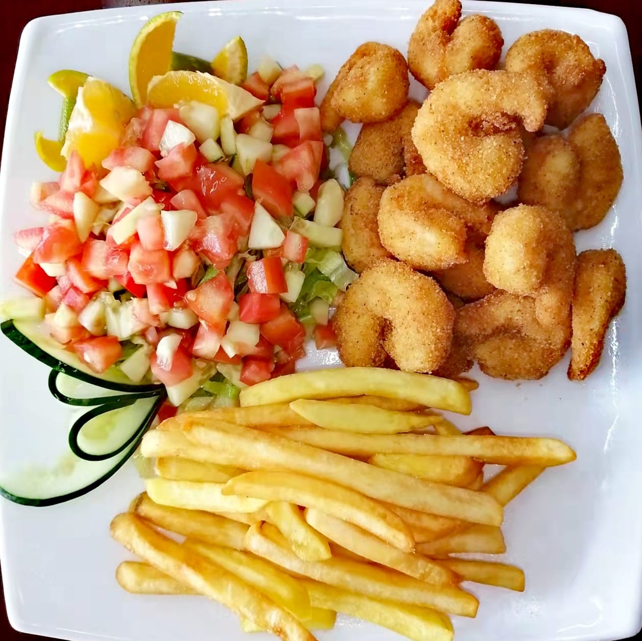 Con papas a la francesa y ensalada