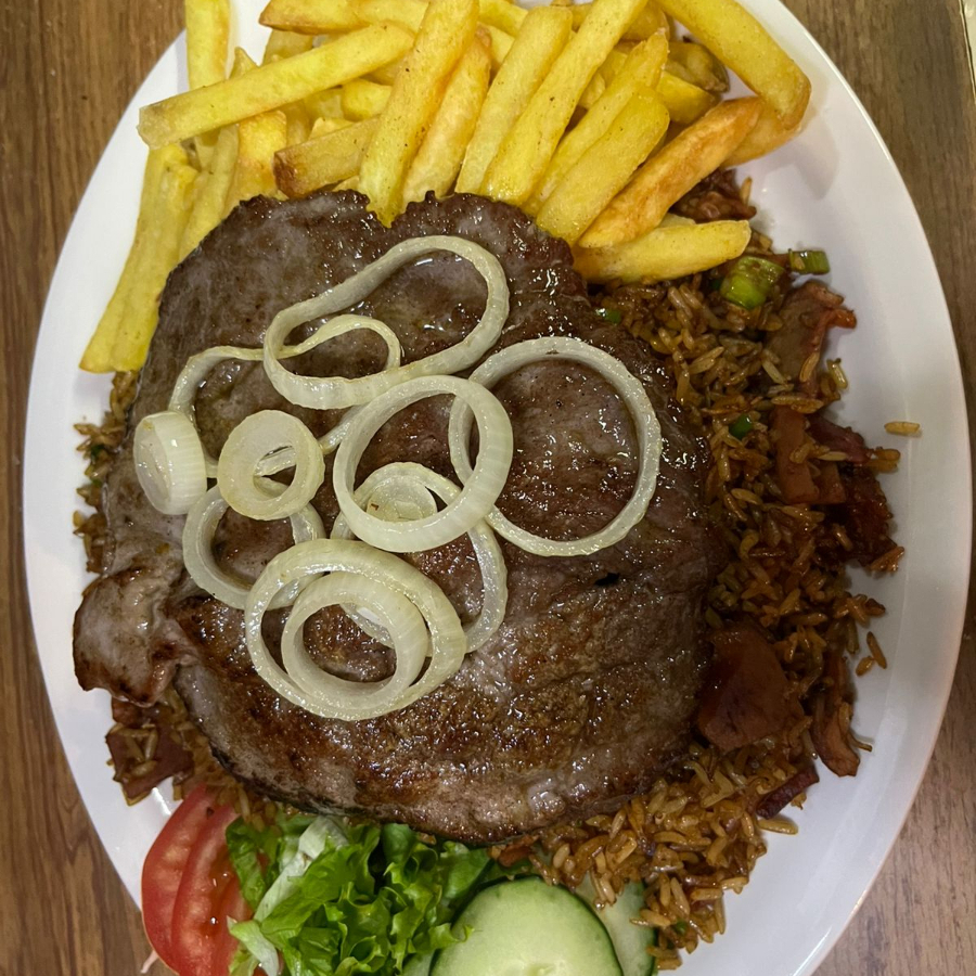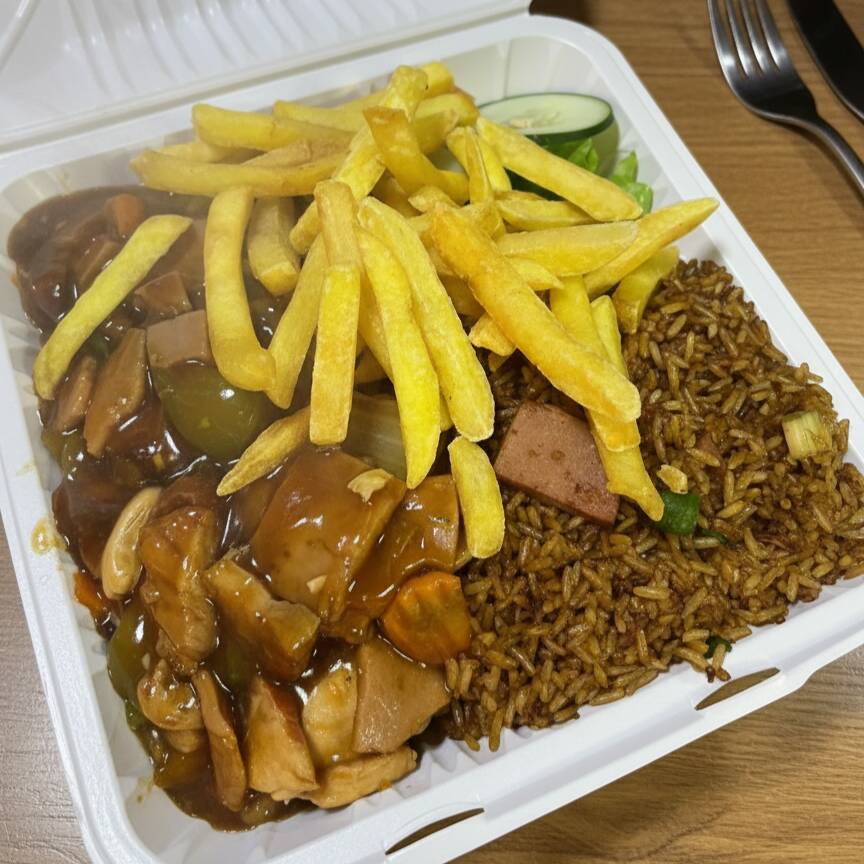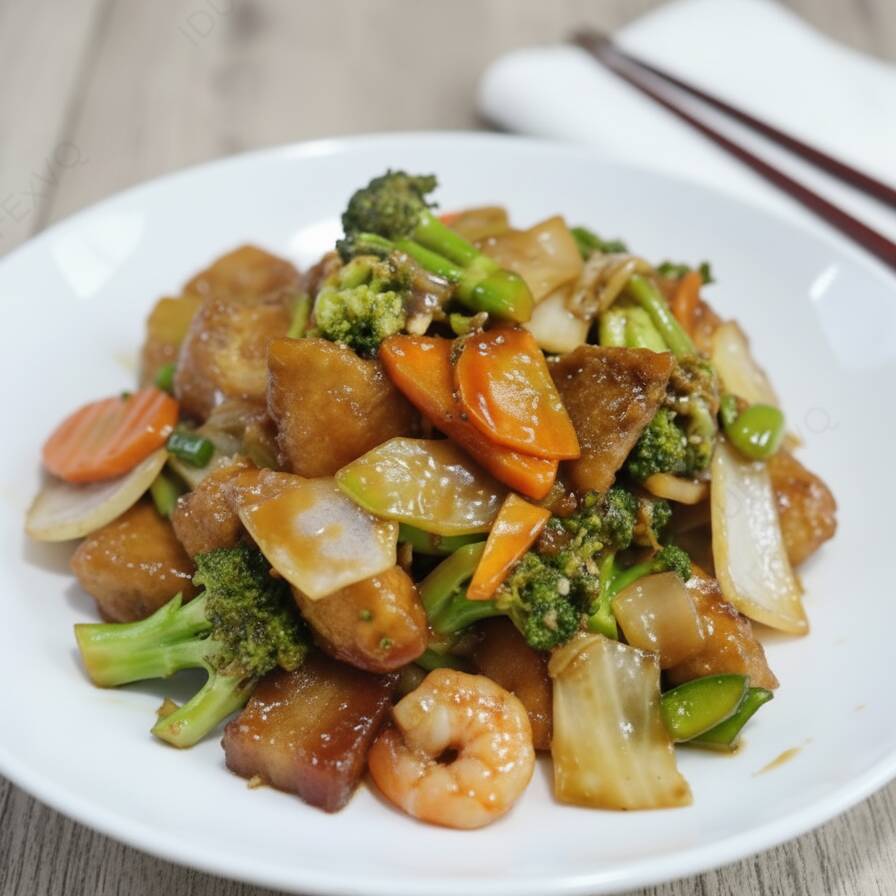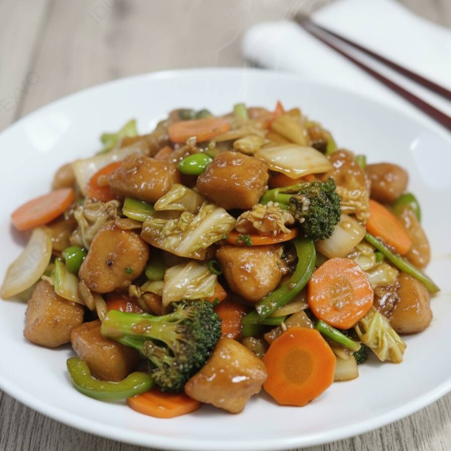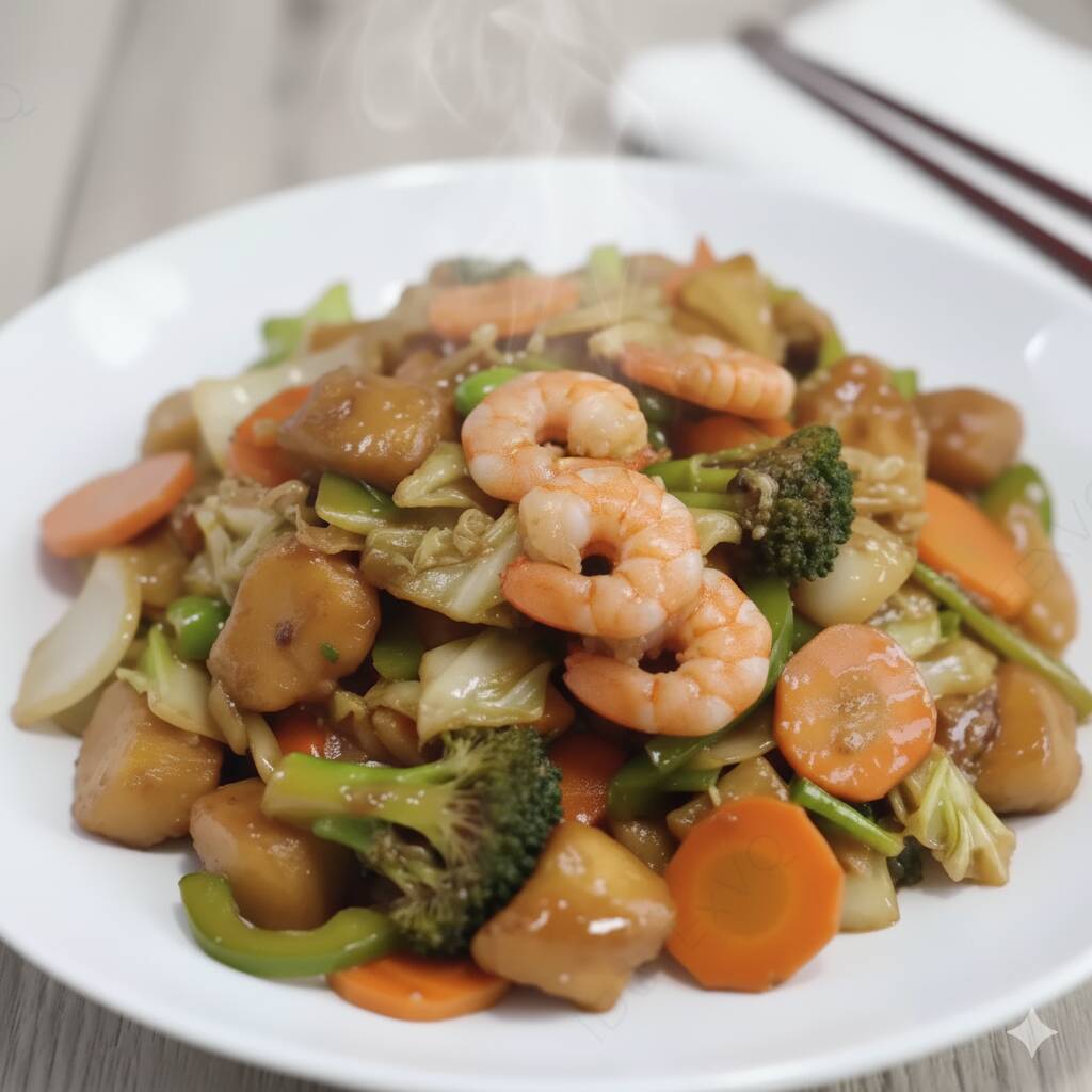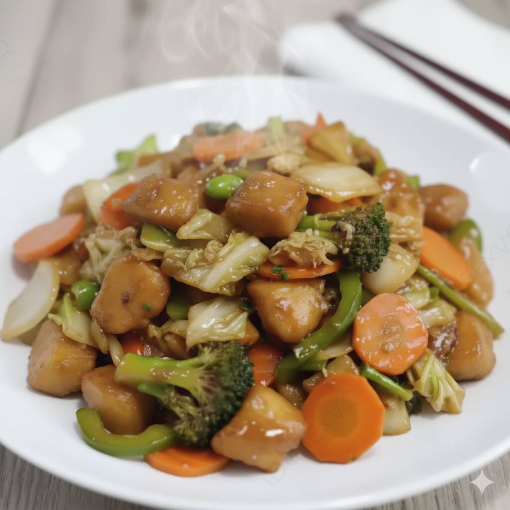 Chop Suey con Pollo, Lechón, Jamón y salsa ostión.
