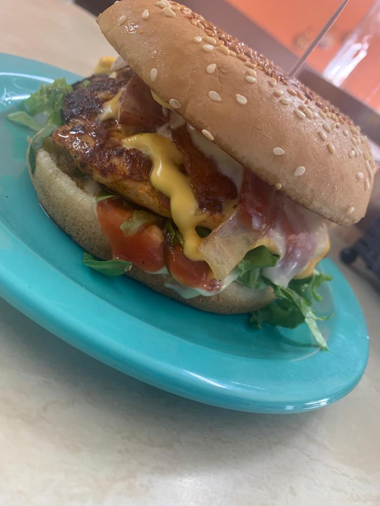 Pan, pechuga 100% de pollo a la plancha o crispy bañada en salsa cheddar, tocineta, lechuga, tomate, cebolla, ketchup y mayonesa de la casa + papas fritas.