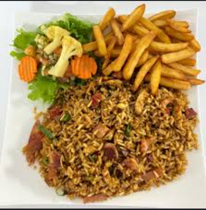 4 Alitas de pollo, arroz cantonés: salsa china, pollo, jamón de cerdo, chorizo chino, cebollín y huevo revuelto. Acompañado de papas fritas y ensalada de tomate, lechuga y pepino.