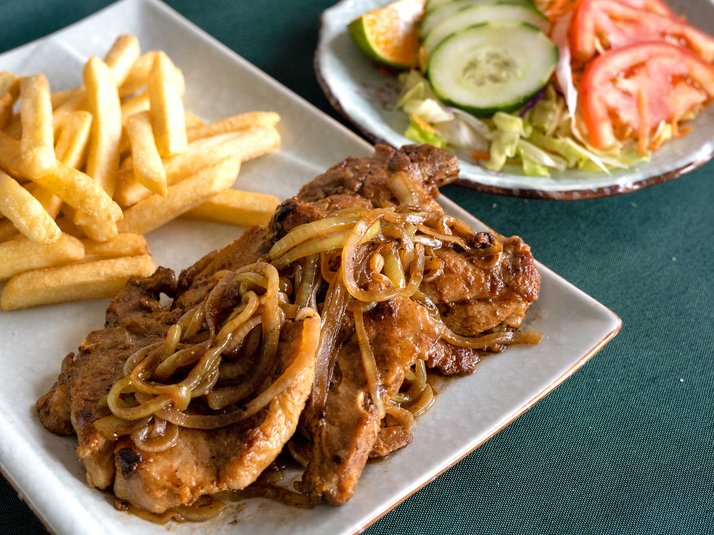 Chuleta Encebollada con Ensalada y Papas Fritas
