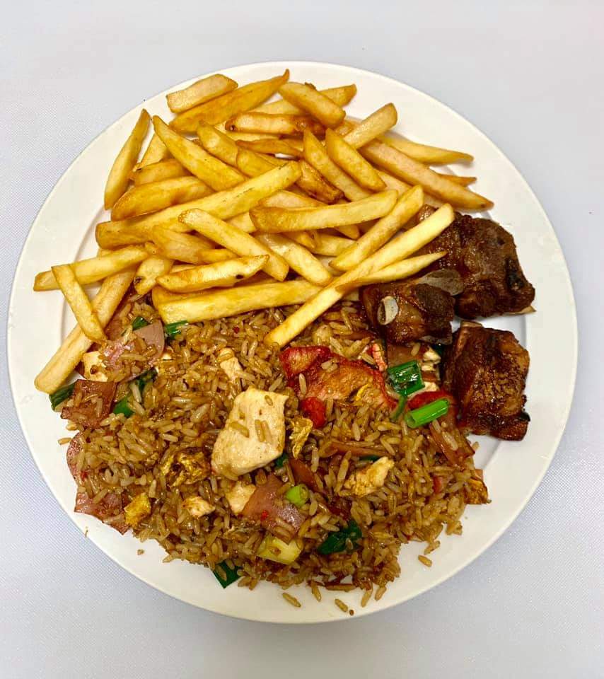 Incluye arroz cantonés y papas. Sin refresco. **EL ARROZ NO ES ENTERO, ES MENOS**