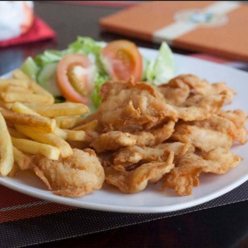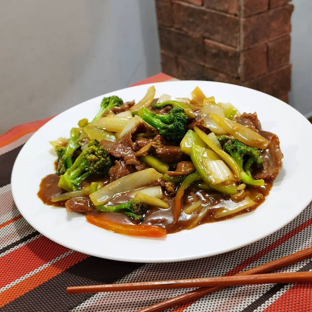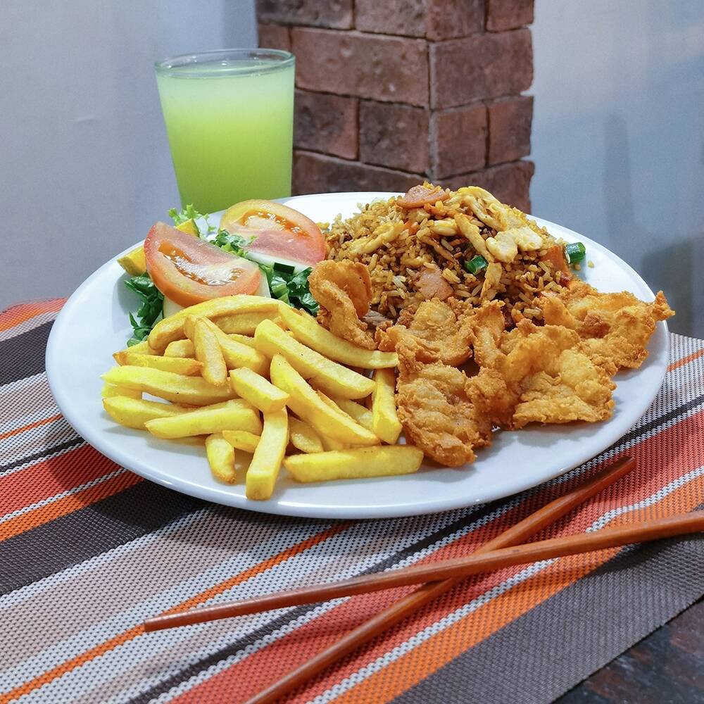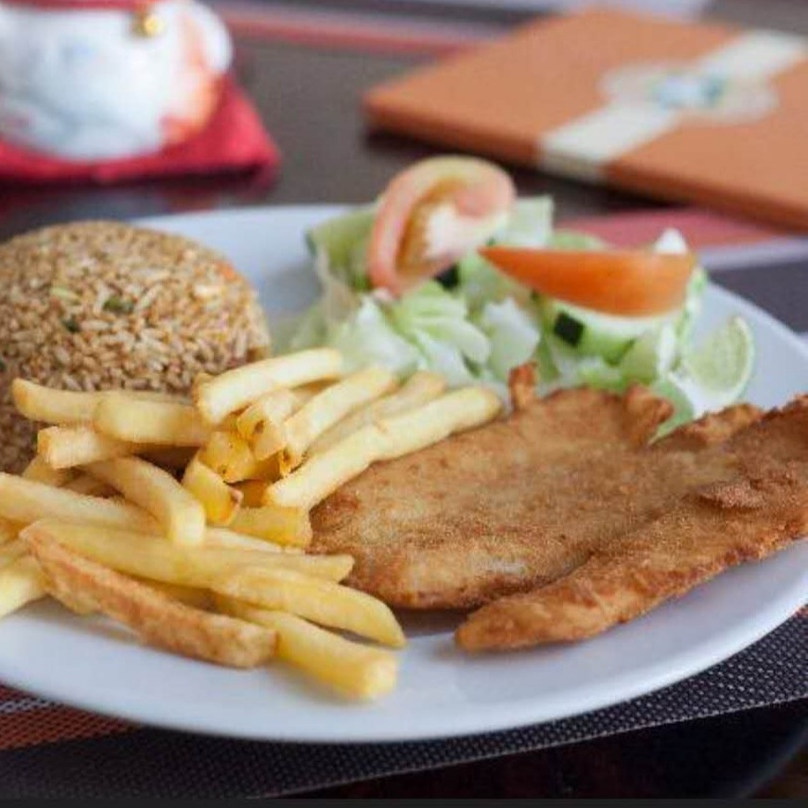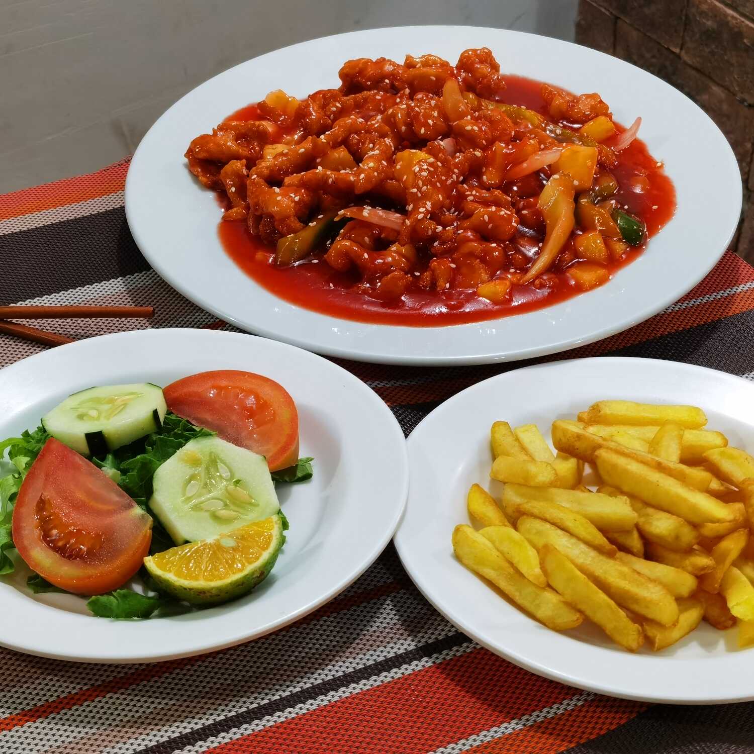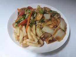 Chop Suey en Salsa la Casa Papas fritas y ensalada