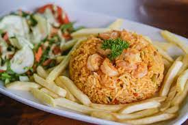 Arroz con Camarones Papas fritas y ensalada.