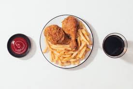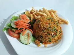 Arroz con pollo, papas fritas y ensalada
