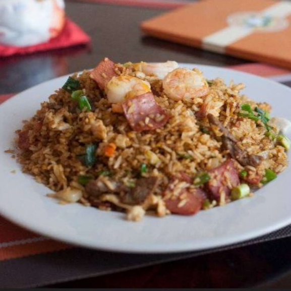 Con carne de res, pollo, carne de cerdo, jamón y camarones.