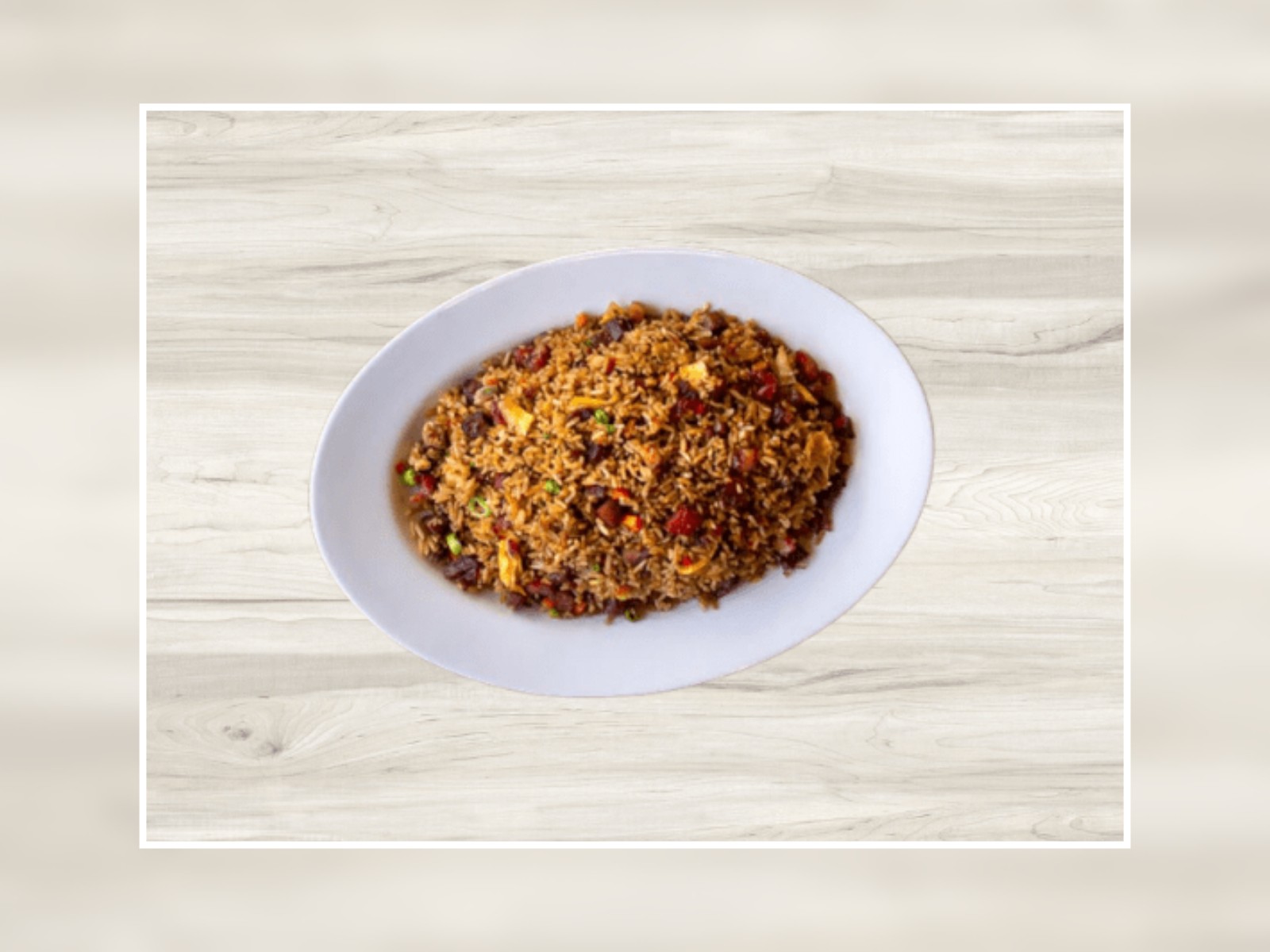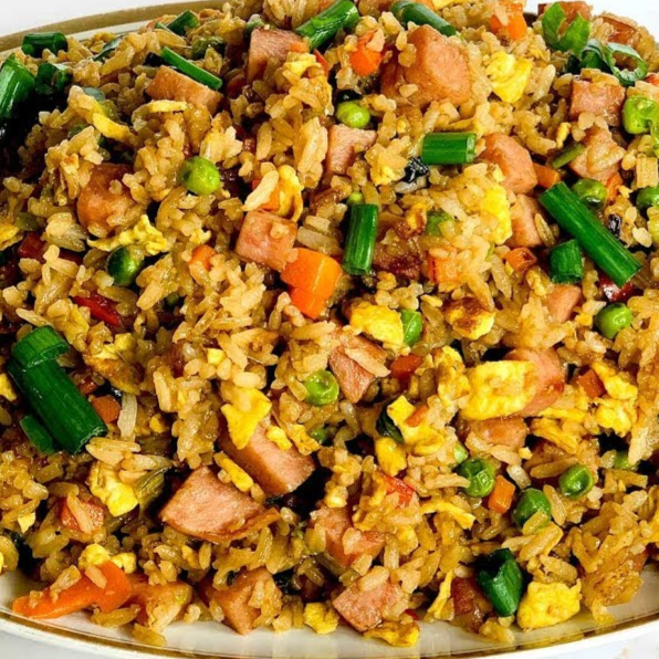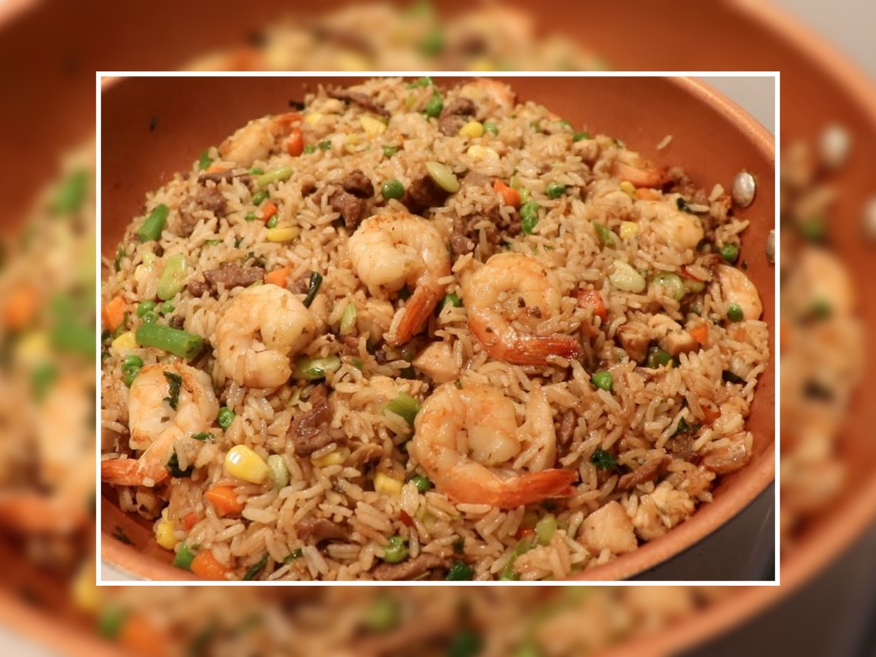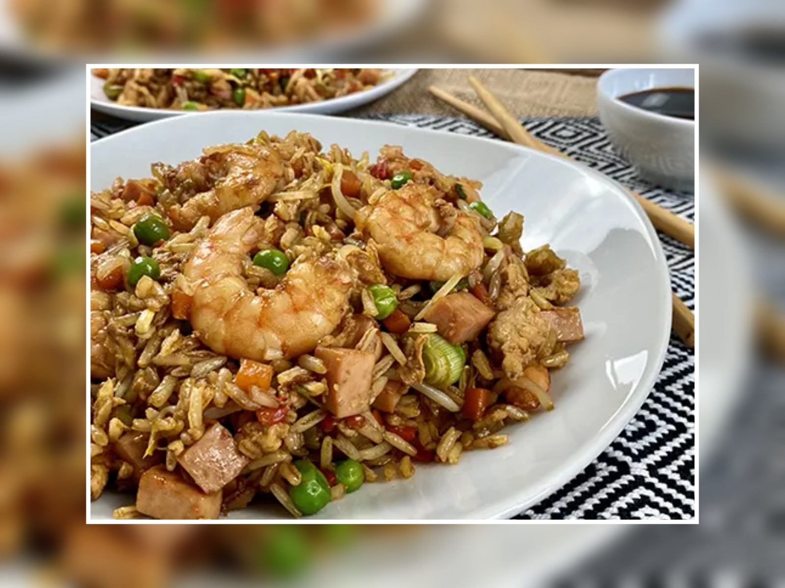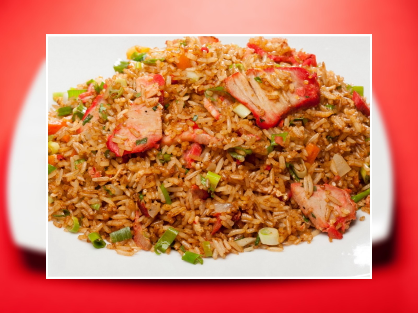 Con pollo, jamón, lechón, lomo, camarones y chorizo chino.