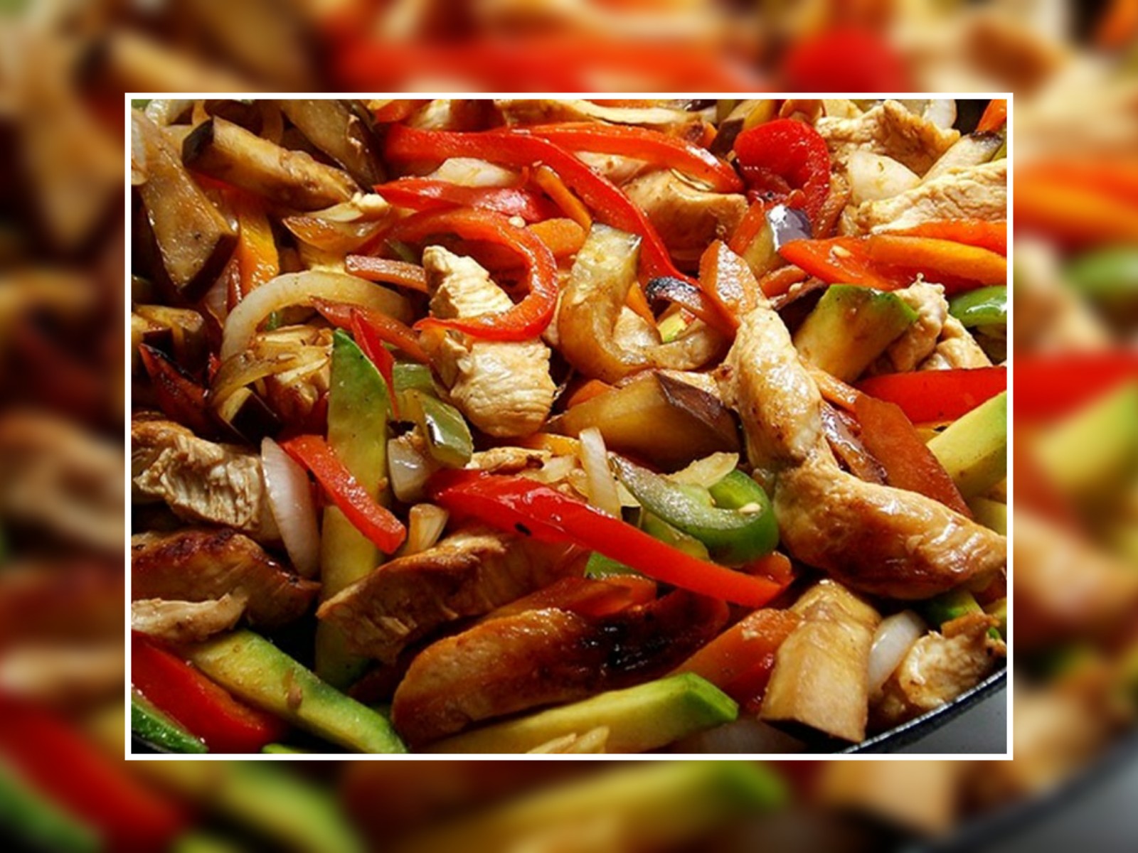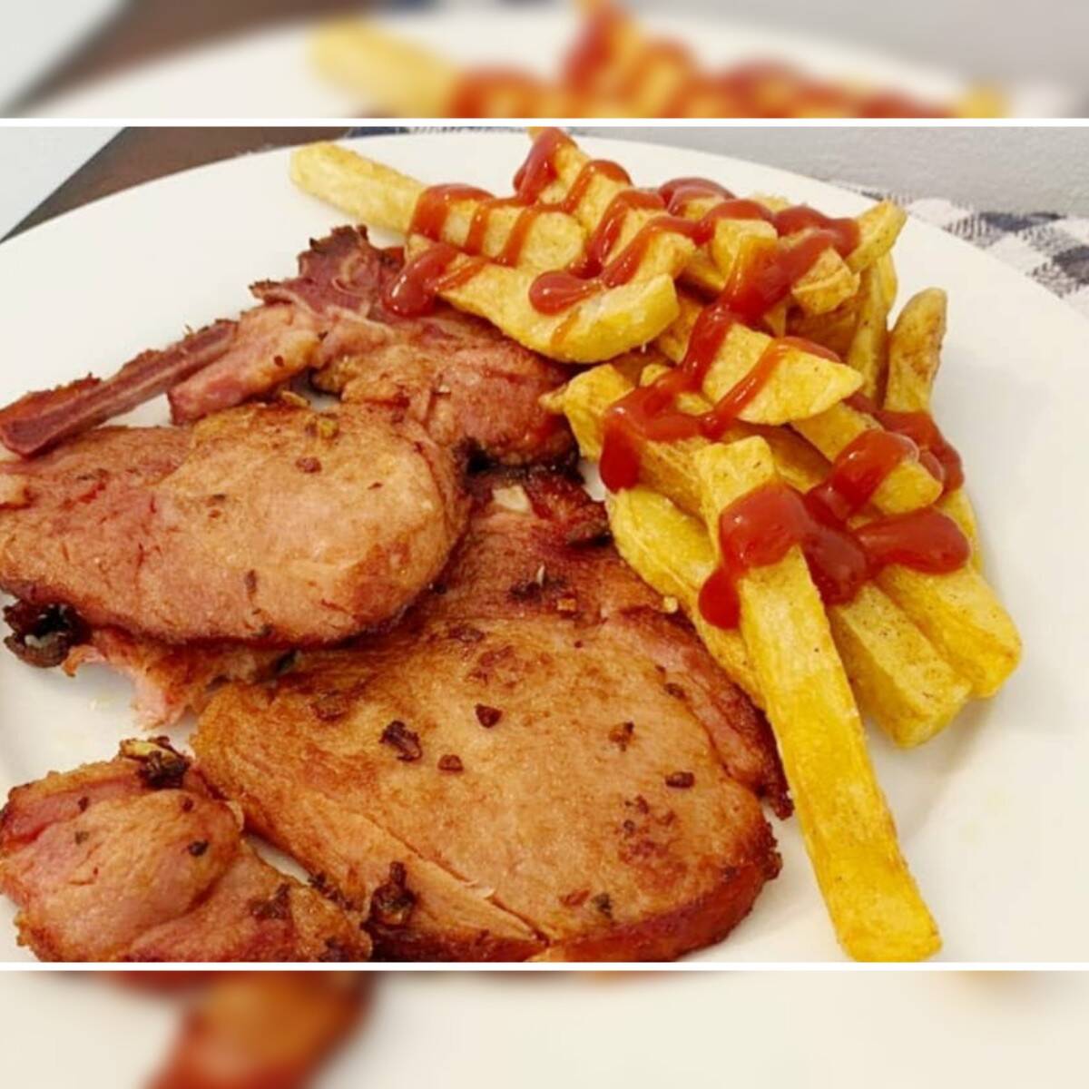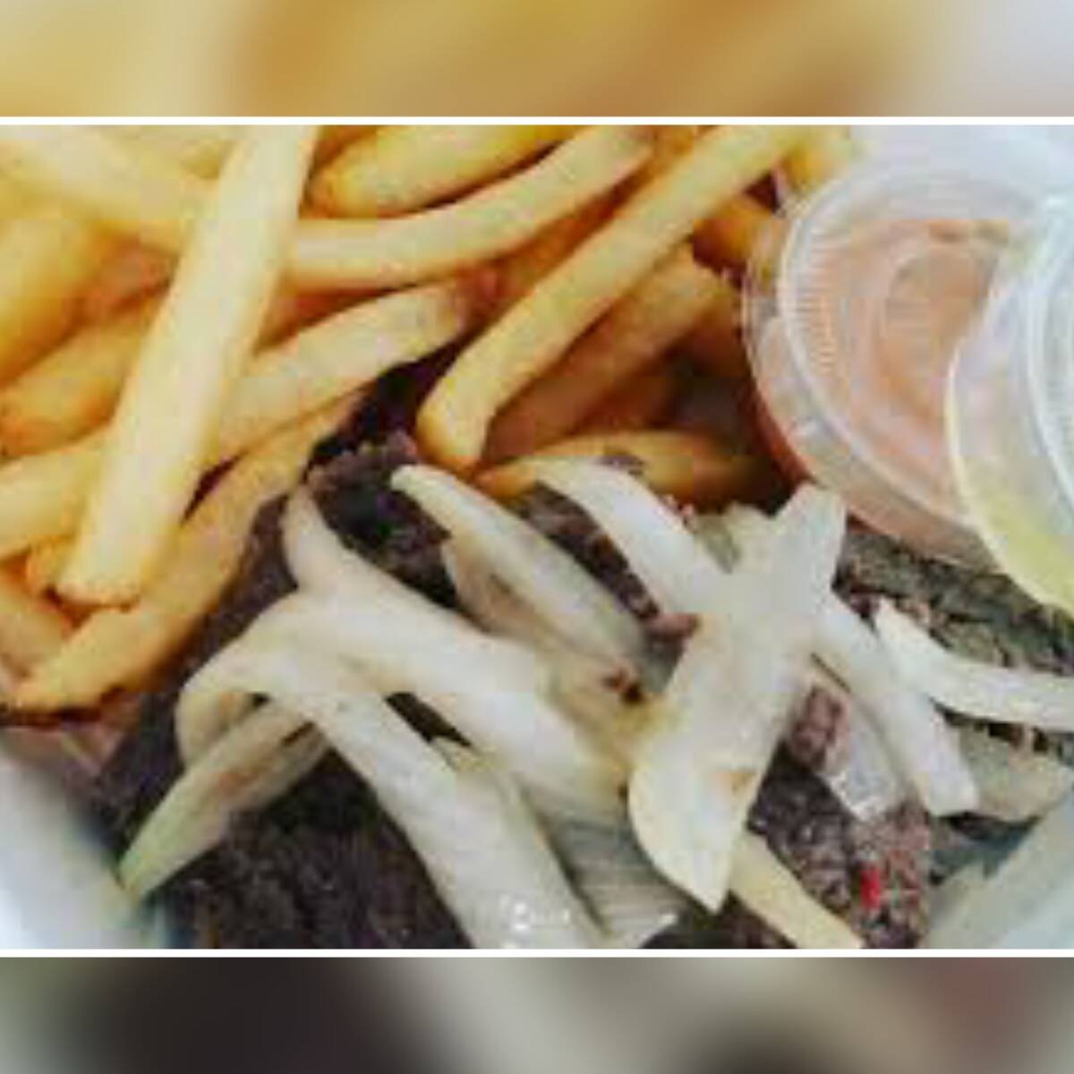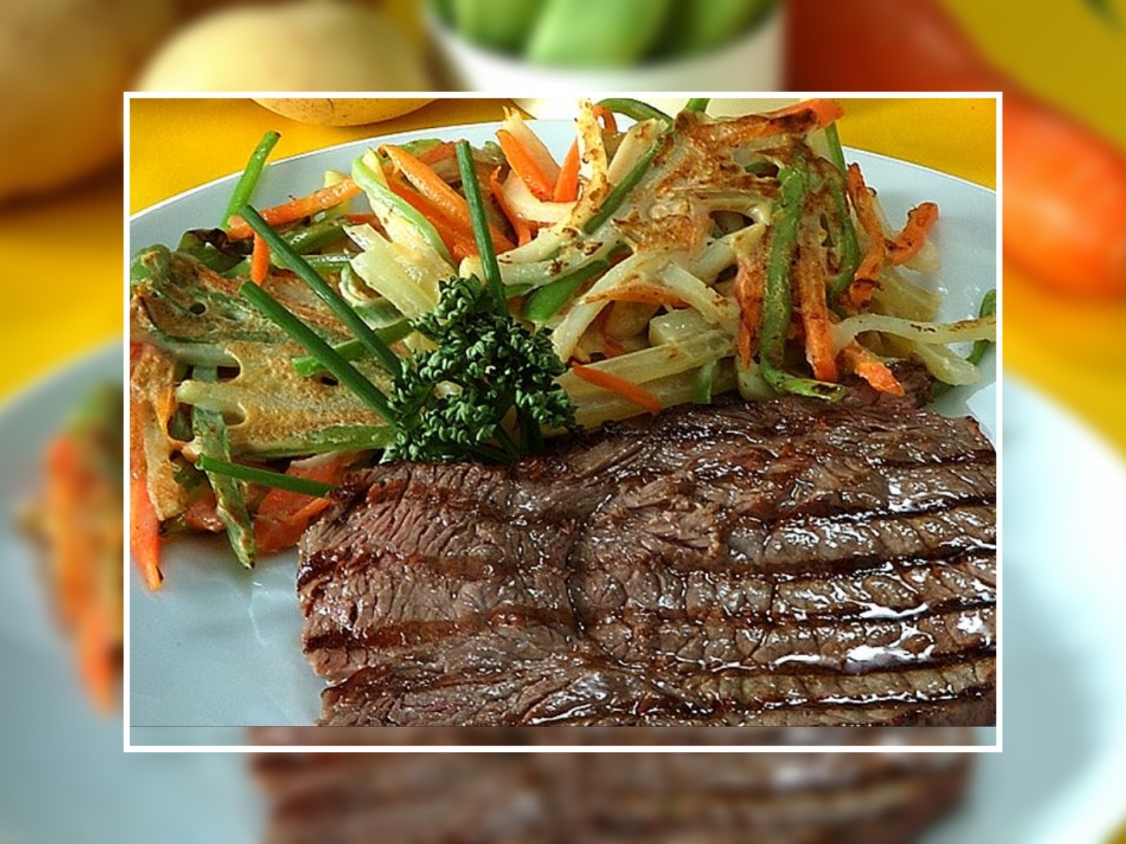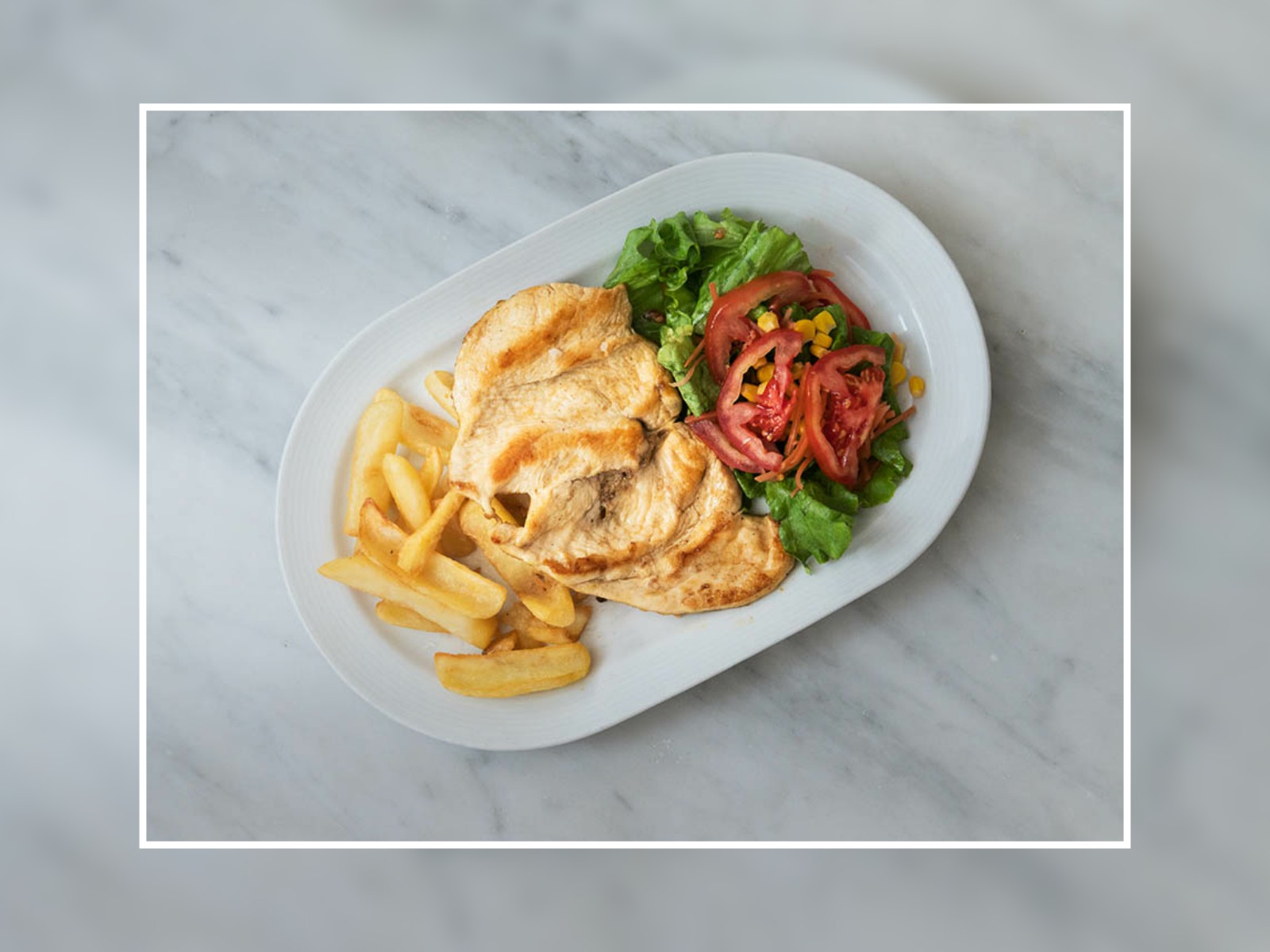 Con cebolla, apio y chile dulce. Incluye ensalada y papas fritas.