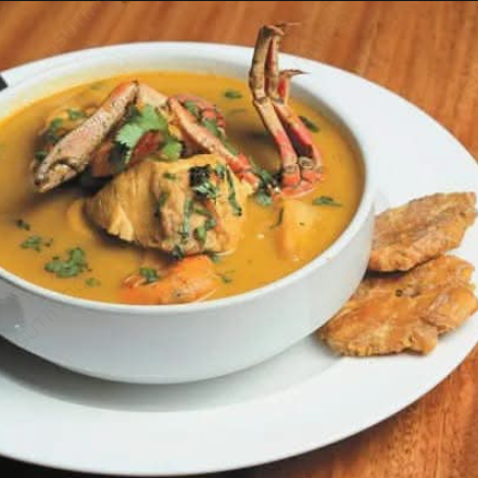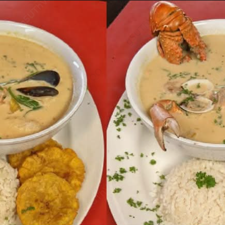 Rica sopa de mariscos mixtos en leche acompañado de arroz blanco y patacones.