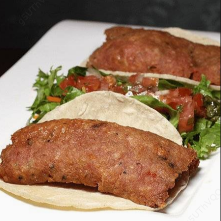Taco frito de tortilla palmeada a mano envuelta con pura carne de res preparada, acompañado de ensalada de repollo y queso frito.