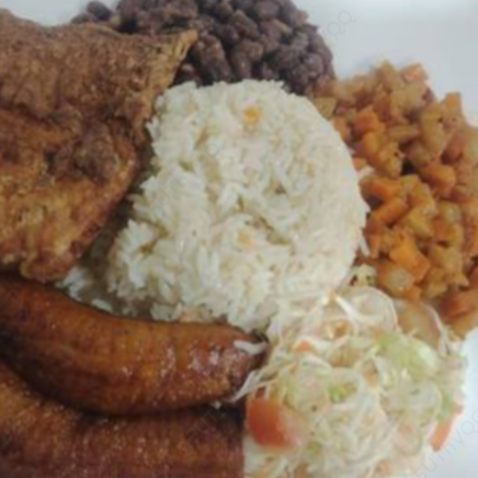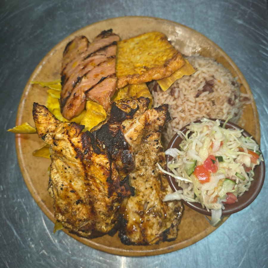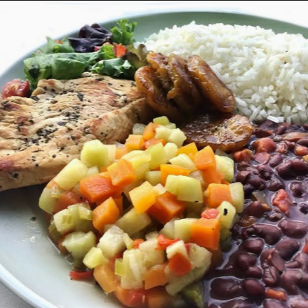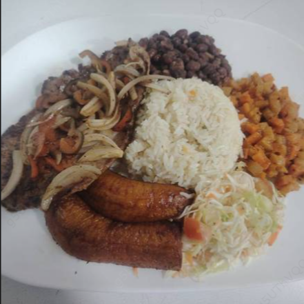 Acompañado de pollo a la plancha, arroz, frijoles, picadillo, ensalada y plátano maduro frito.