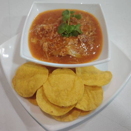 Rica carne mechada al estilo mexicano con un toque de chile acompañado de doraditas tostadas de maíz.