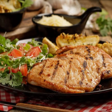 Corte fino de lomito de cerdo tierno a la parrilla con ensalada. Elige tu salsa (chipotle o barbacoa) y acompañamiento (patacón, yuca frita, papas a la francesa).