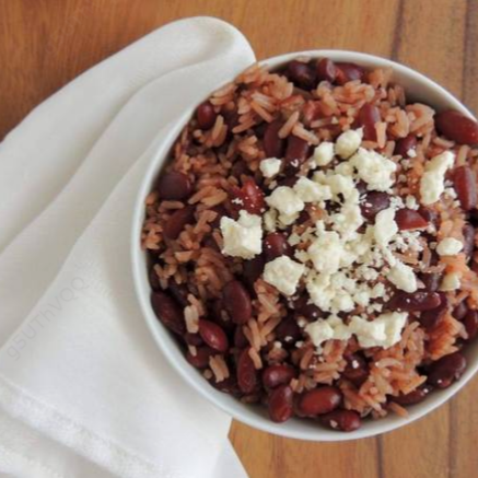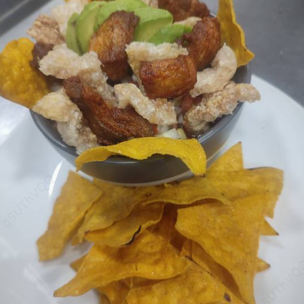 Especialidad de la casa con rico arroz fresco y frijoles tiernos, acompañado de chicharrón frito y chicharrón de concha junto al pico de gallo, doraditas de maíz y fresco aguacate.