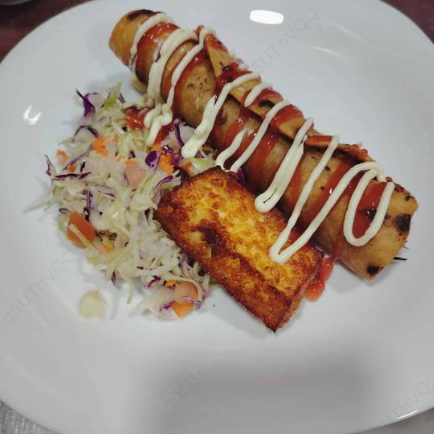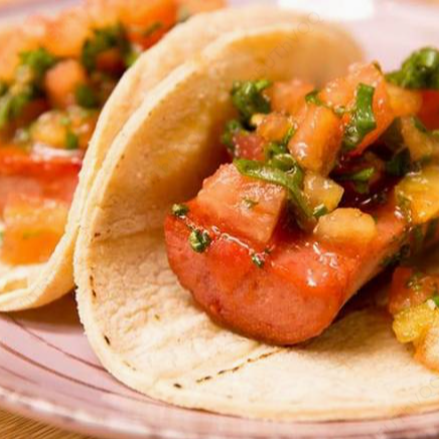 Nuestro gallo de salchichón va acompañado con tortilla palmeada. Elige entre pico de gallo o ensalada de repollo.