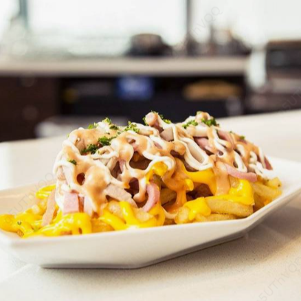 Ricas papas a la francesa al estilo supremas acompañadas con frijoles licuados, carne mechada, rica ensalada de repollo y pico de gallo; bañadas con salsa de chile chipotle, aderezo de ajo y salsa de queso Cheddar.