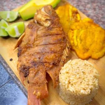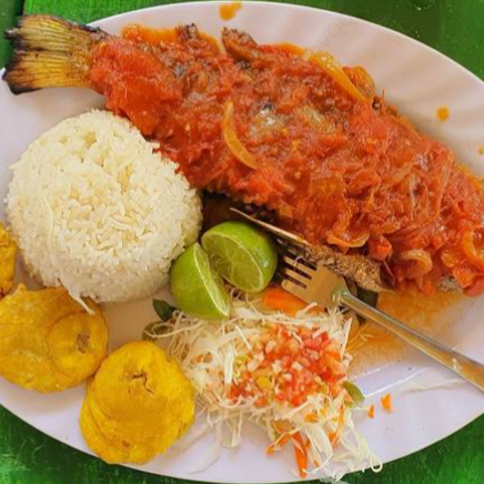 Rico pescado entero frito en salsa Tipitapa acompañado de patacones, arroz y ensalada.