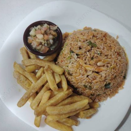 Delicioso arroz con trozos de cerdo fresco hecho al momento, acompañado de ricas papas a la francesa, pico de gallo y ensalada. Opción de cambiar papas por patacones o yuca frita.