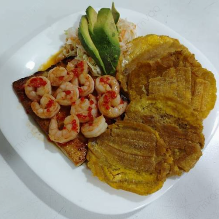 Delicioso filete de pescado relleno de camarones al ajillo acompañado de ensalada de repollo y patacones (o papas a la francesa).