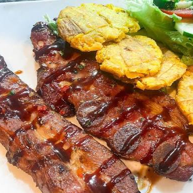 Rica costilla de cerdo bañada en salsa barbacoa o salsa Buffalo. Elige entre patacones o yuca frita, y ensalada de repollo o pico de gallo.