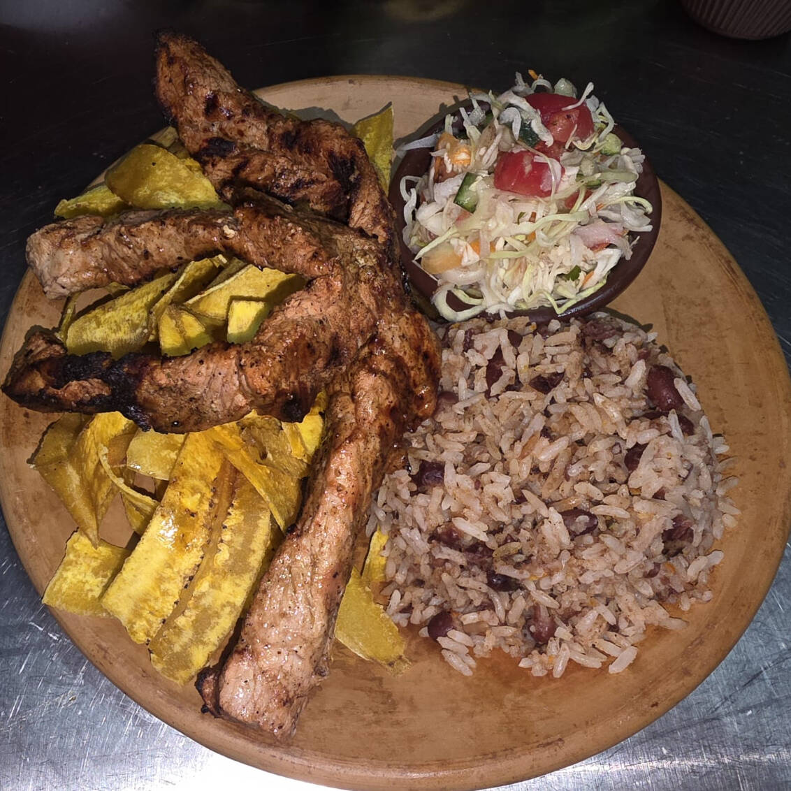 Carne de cerdo asada acompañada de tajadas fritas, gallo pinto, ensalada y chorizo. Puedes elegir entre tajadas fritas, plátano maduro o tortilla palmeada.
