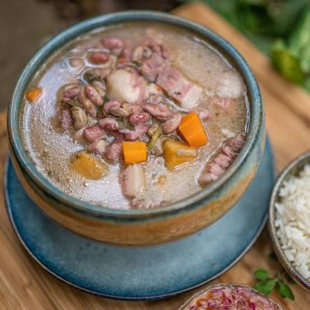 Nuestros frijoles tiernos con trozo de costilla acompañados de arroz blanco.