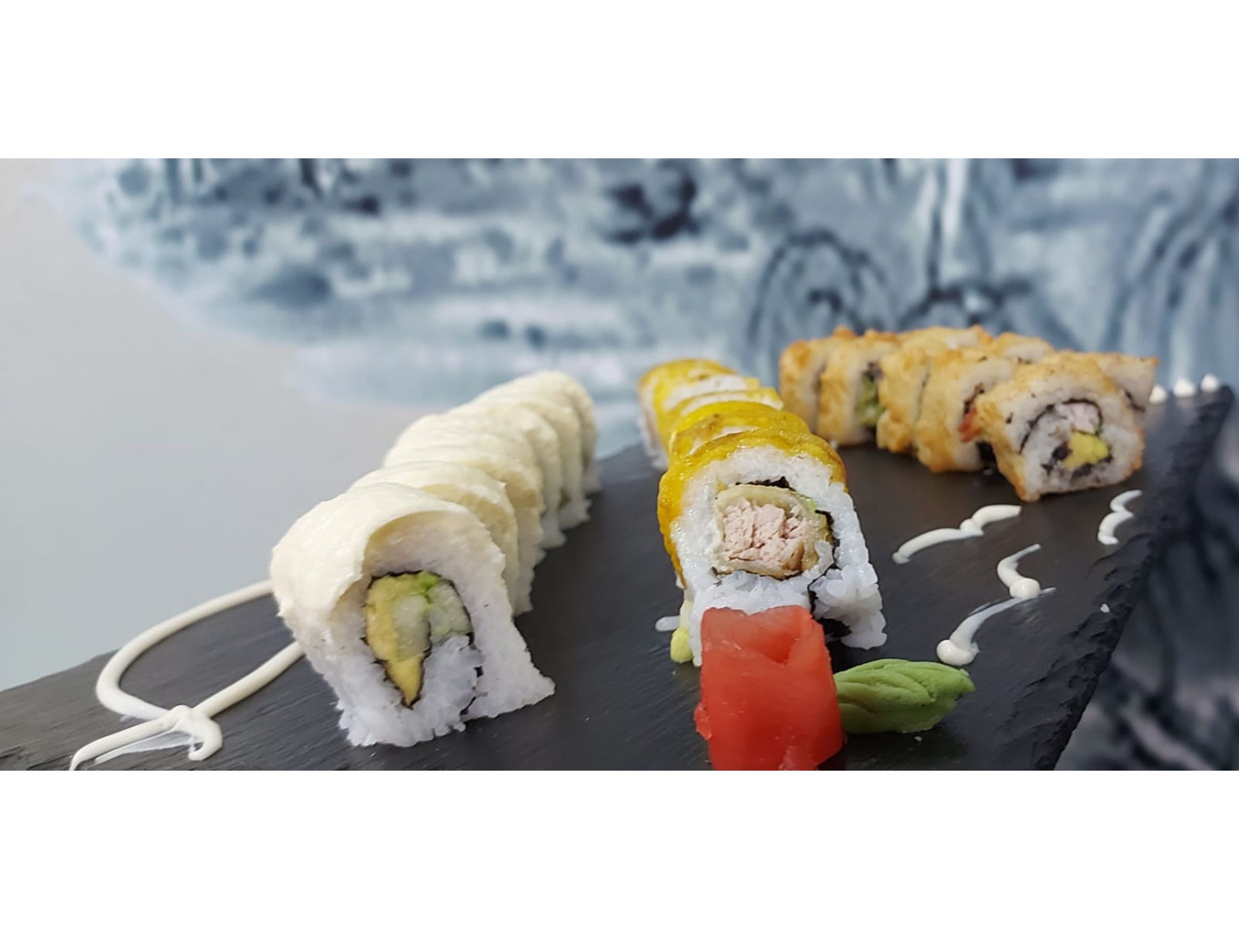 California: aguacate ,pepino ,surime cobertura de ajonjolí -- Tempura : queso crema, pescado ,aguacate ,(frito)--Maruya : pollo tempura,queso crema,cobertura de plátano maduro.
