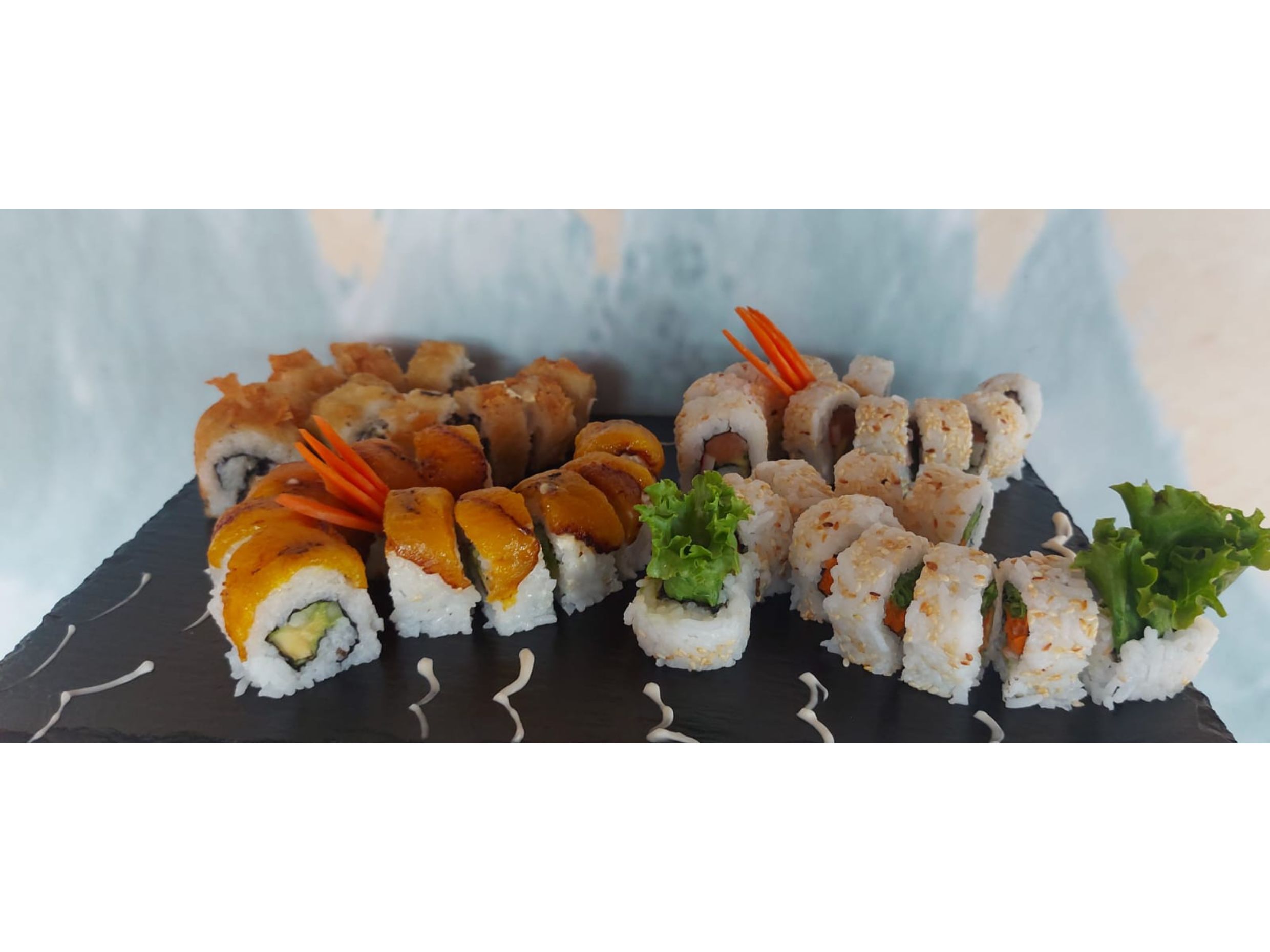 Tempura: aguacate, pescado, queso crema (frito)*1 + Baboy: tocineta, platano maduro, cobertura de tanuki*1 + Calufornia: surime, aguacate y pepino, cobertura de ajonjolí*1incluye (30 piezaspara max 2 personas)
