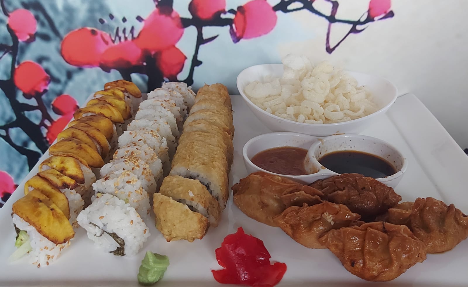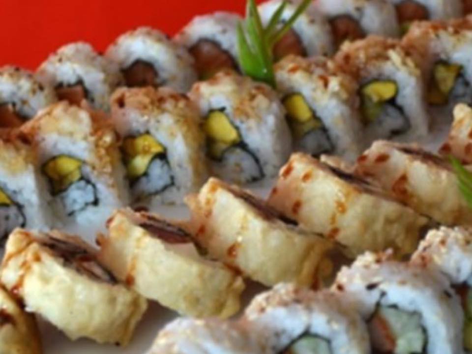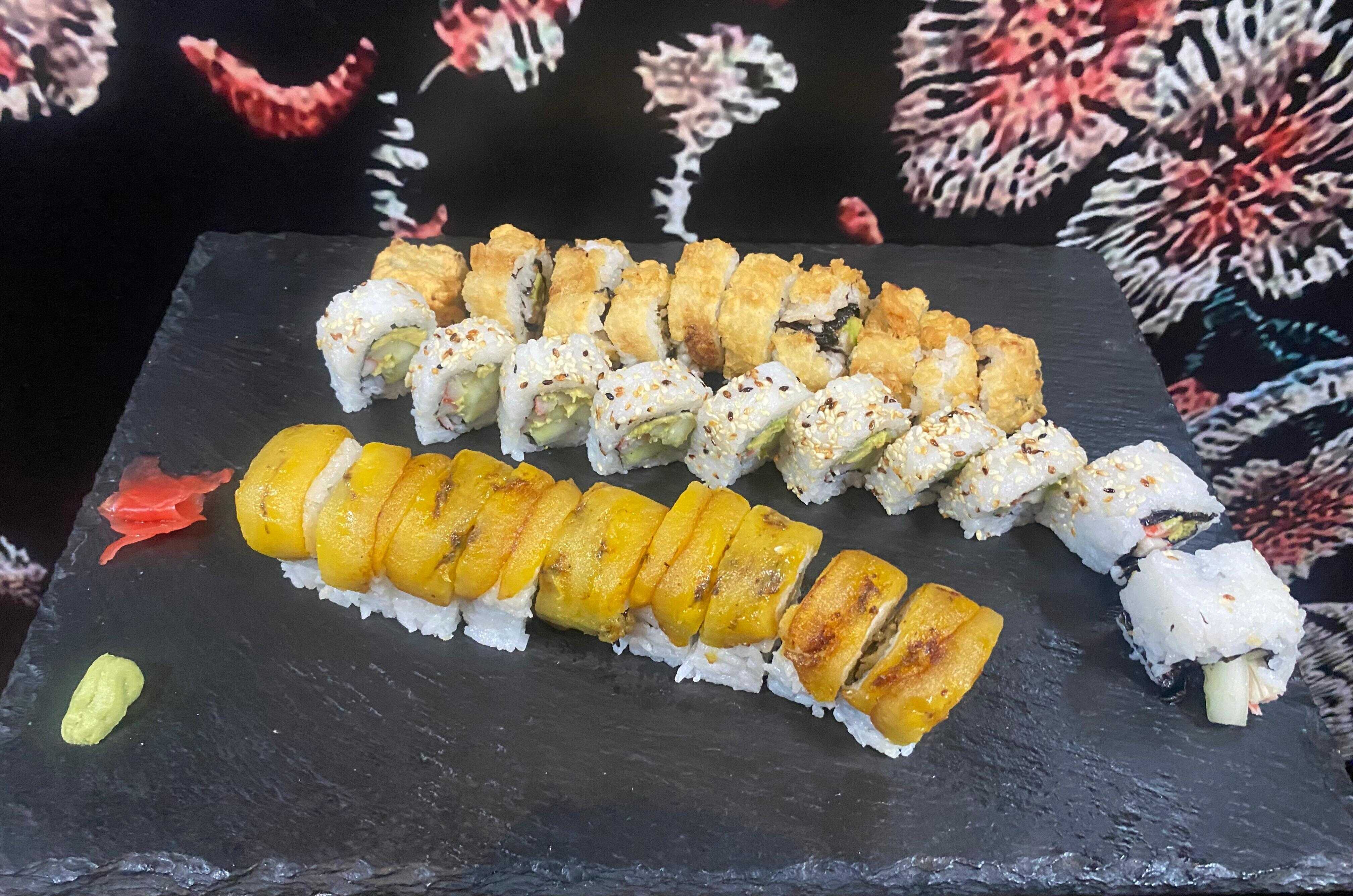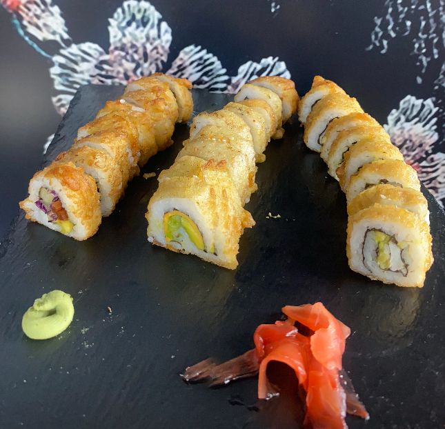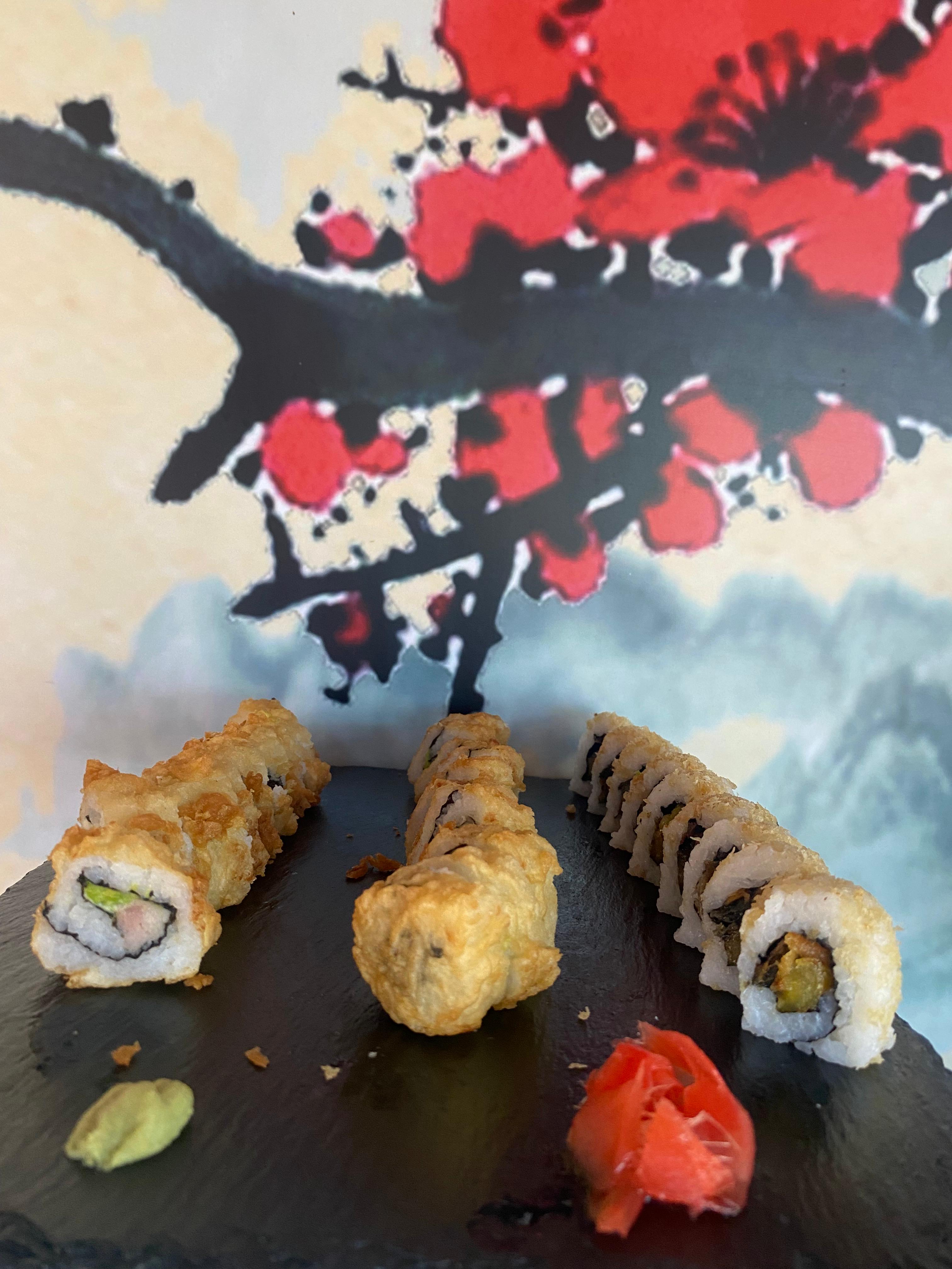 Tempura: aguacate ,pescado y queso crema (frito)--Plátano maduro ,piel de salmón cobertura de tanuki--Chaeso Repollo,zanahoria ,pepino y aguacate (frito).