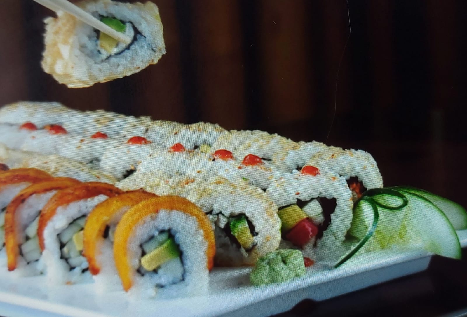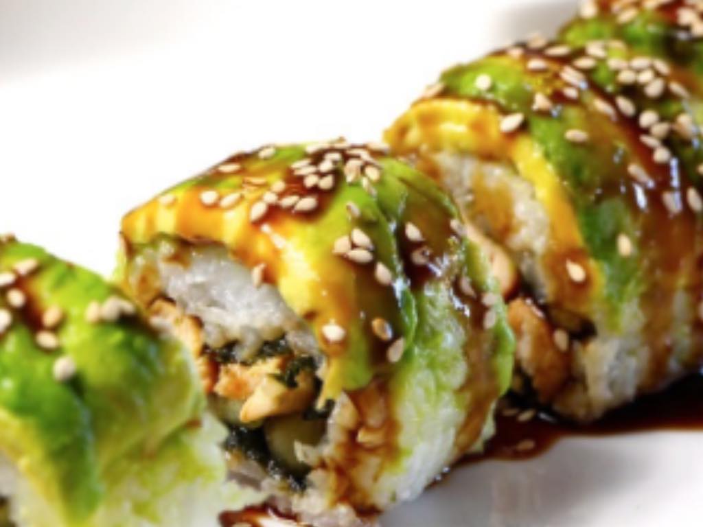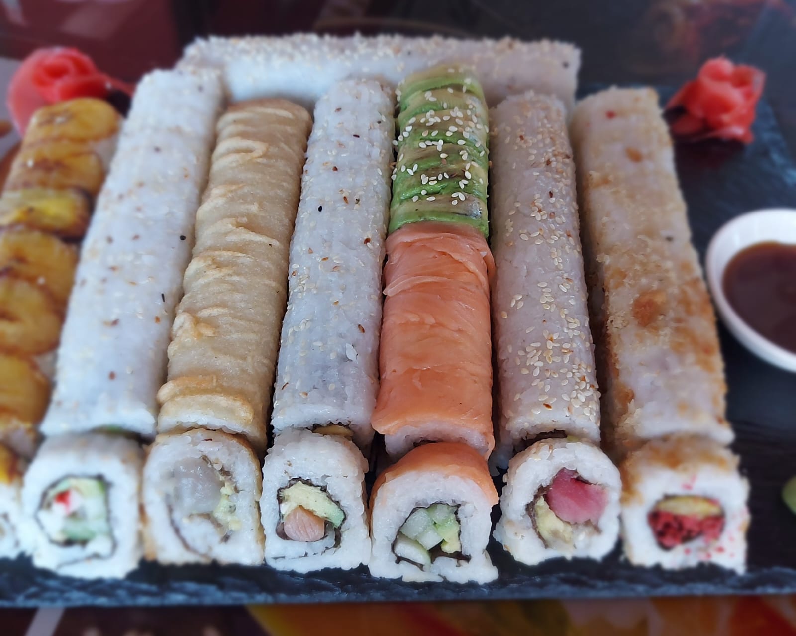 Tempura: aguacate ,pescado y queso crema (frito)--Plátano maduro ,piel de salmón cobertura de tanuki--Chaeso Repollo,zanahoria ,pepino y aguacate (frito).