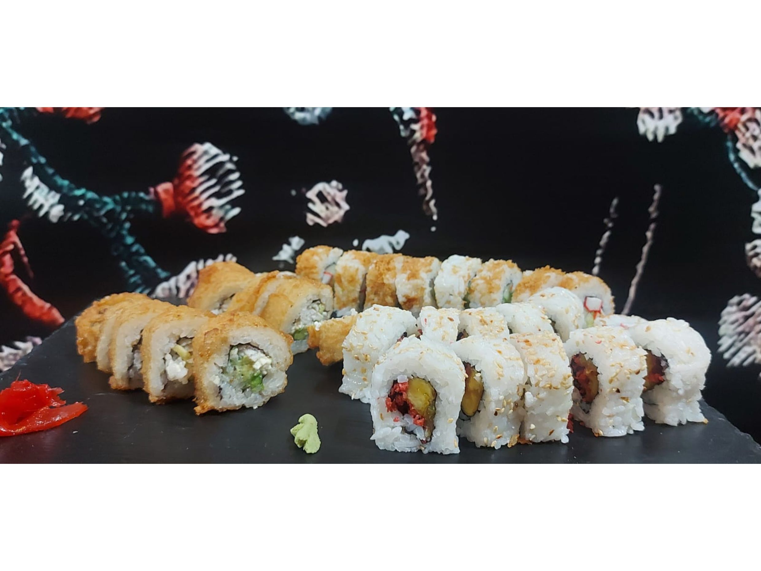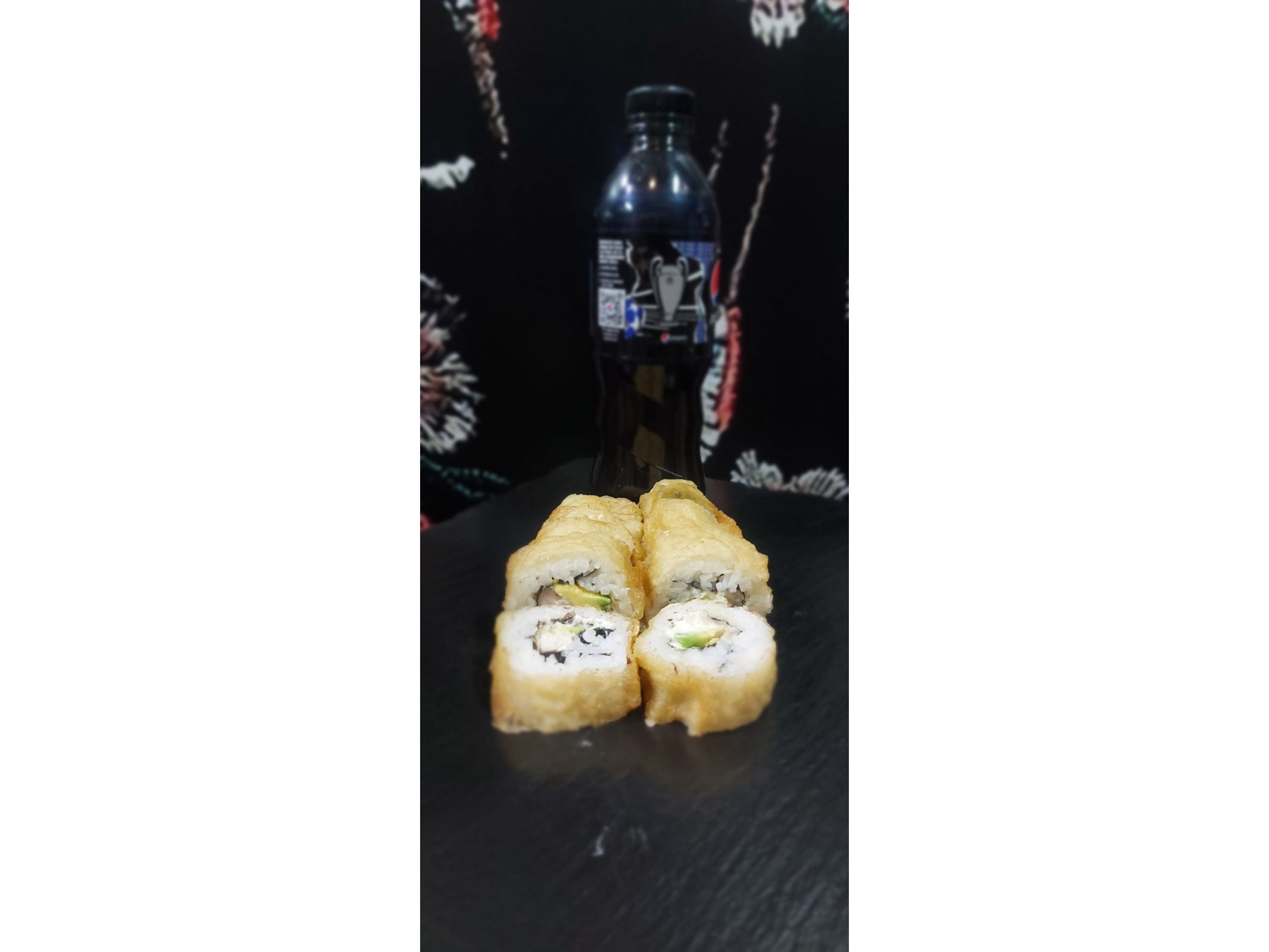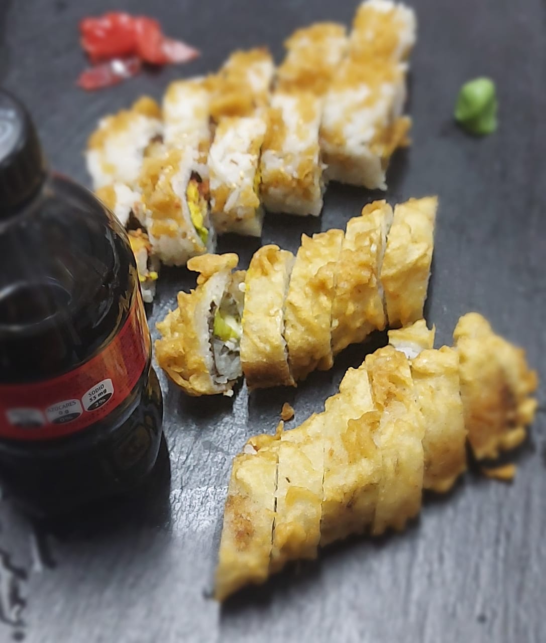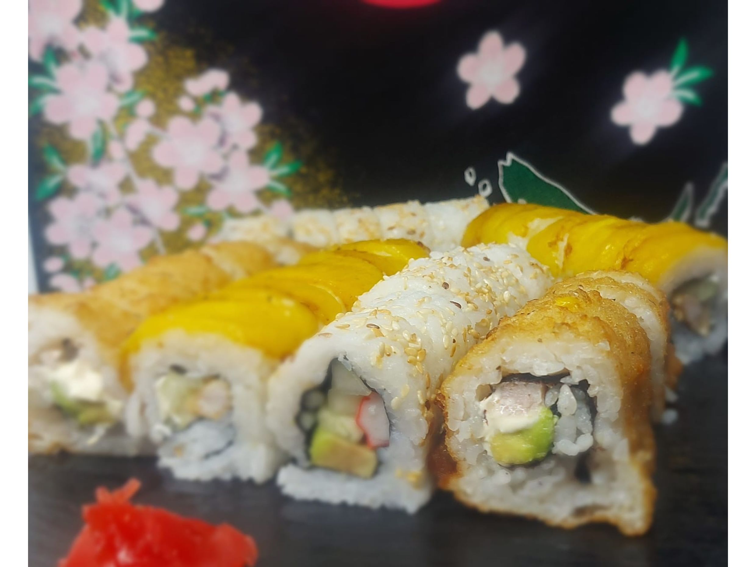 Tempura: aguacate ,pescado y queso crema (frito)--Plátano maduro ,piel de salmón cobertura de tanuki--Chaeso Repollo,zanahoria ,pepino y aguacate (frito).