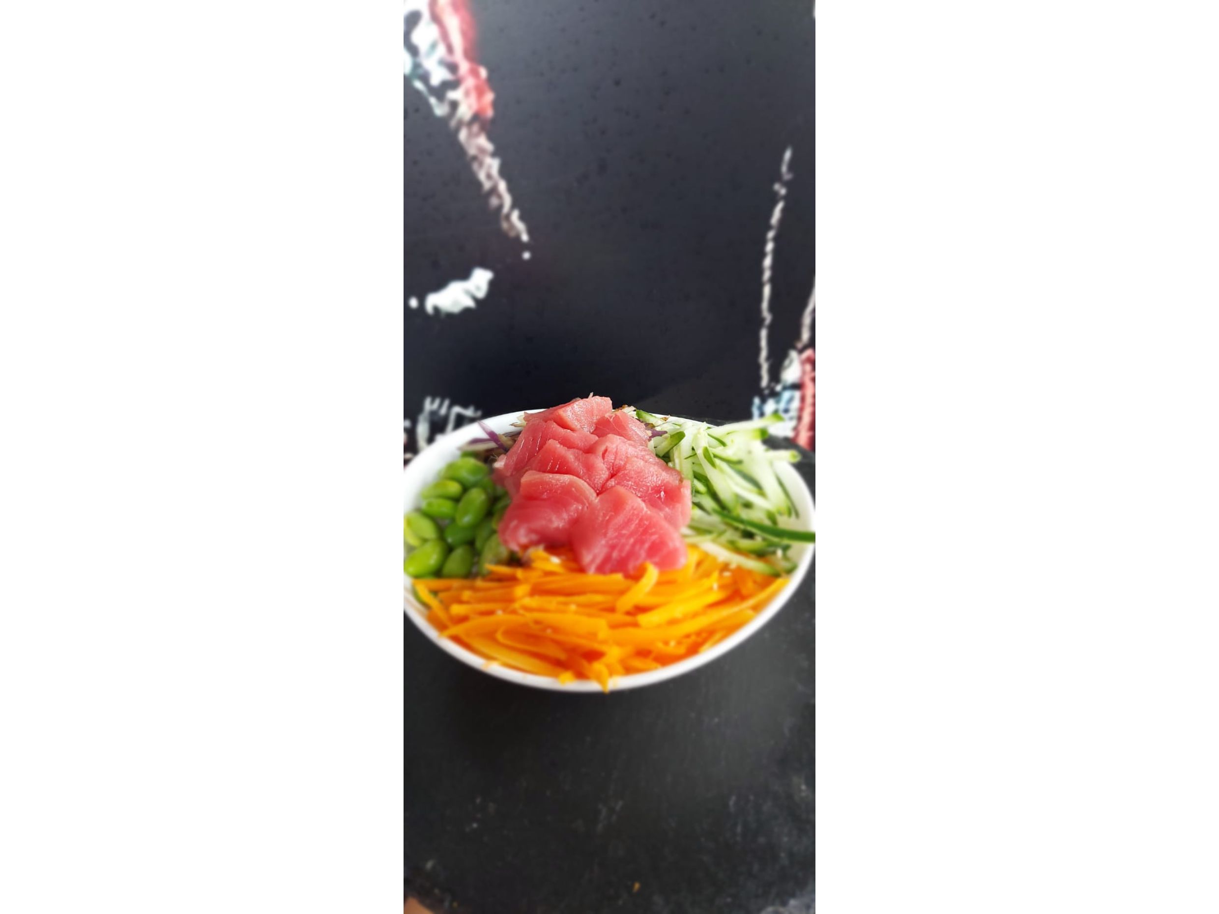 Arroz de sushi Zanahoria ,pepino Repollo,edamame Salmón crudo.