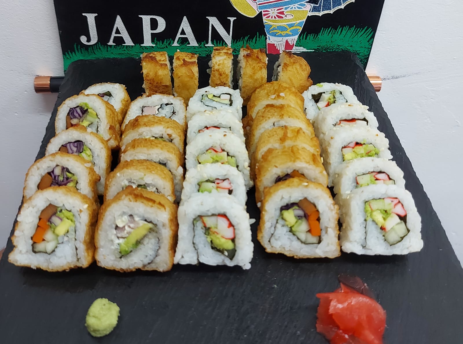 California (10 piezas,) (pepino, aguacate y surimi, cobertura con ajonjolí), Tempura (10 piezas) (Pescado crudo, queso crema y aguacate) (viene frito) y Philadelphia (10 piezas) (salmón, aguacate, queso crema, cobertura de ajonjolí) (30 unidades), adiciones paquetitos (jengibre, wasabi, salsa de soya, salsa de anguila)(para max 2 personas) incluye salsas