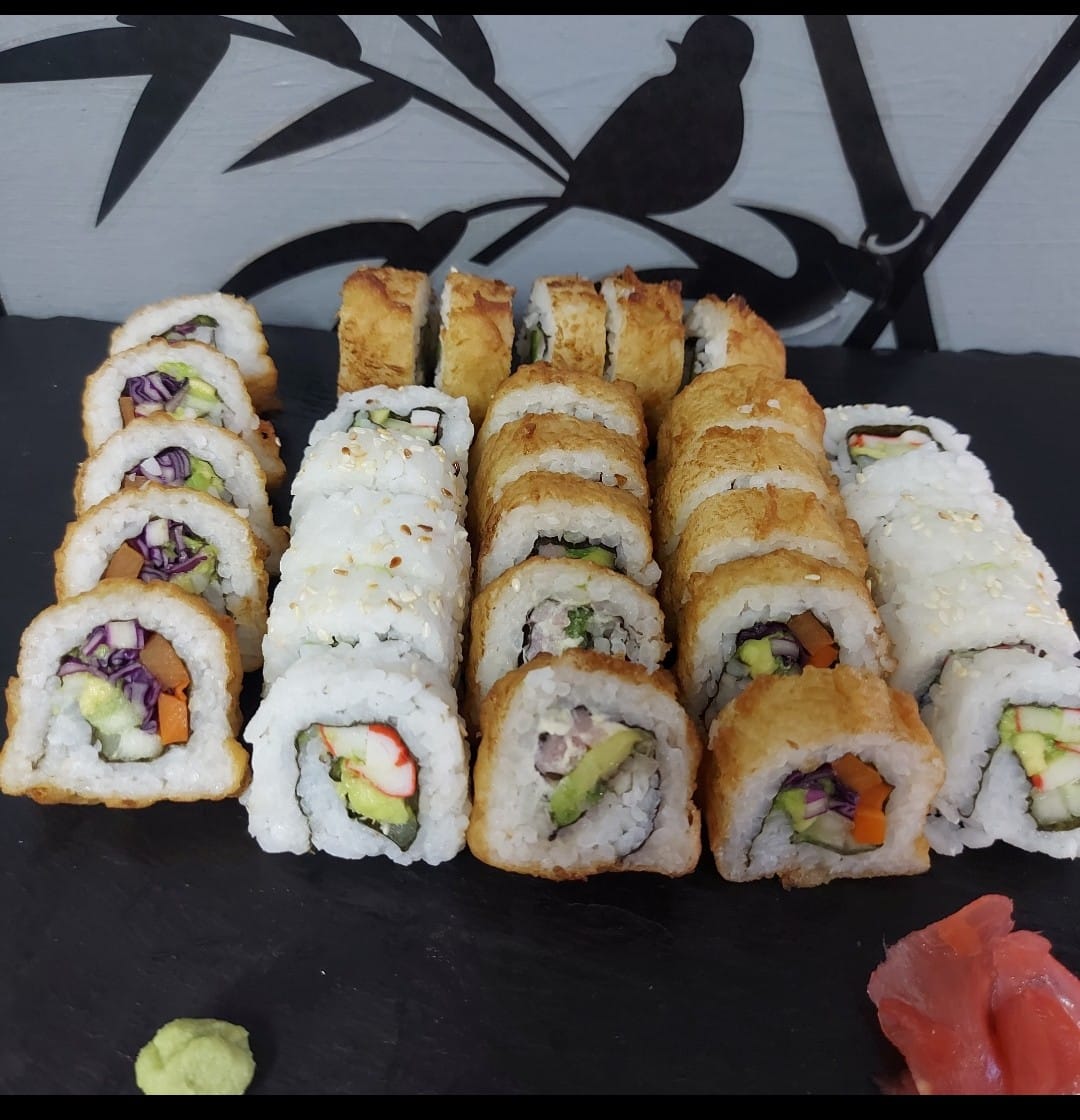 30 piezas de sushi: California: surime, aguacate y pepino cobertura de ajonjoli Tempura: pescado, aguacate y queso crema (tempurizado) Tico: Aguacate,pepino y cobertura de plátano maduro.(incluye salsas) (para max 2 personas)