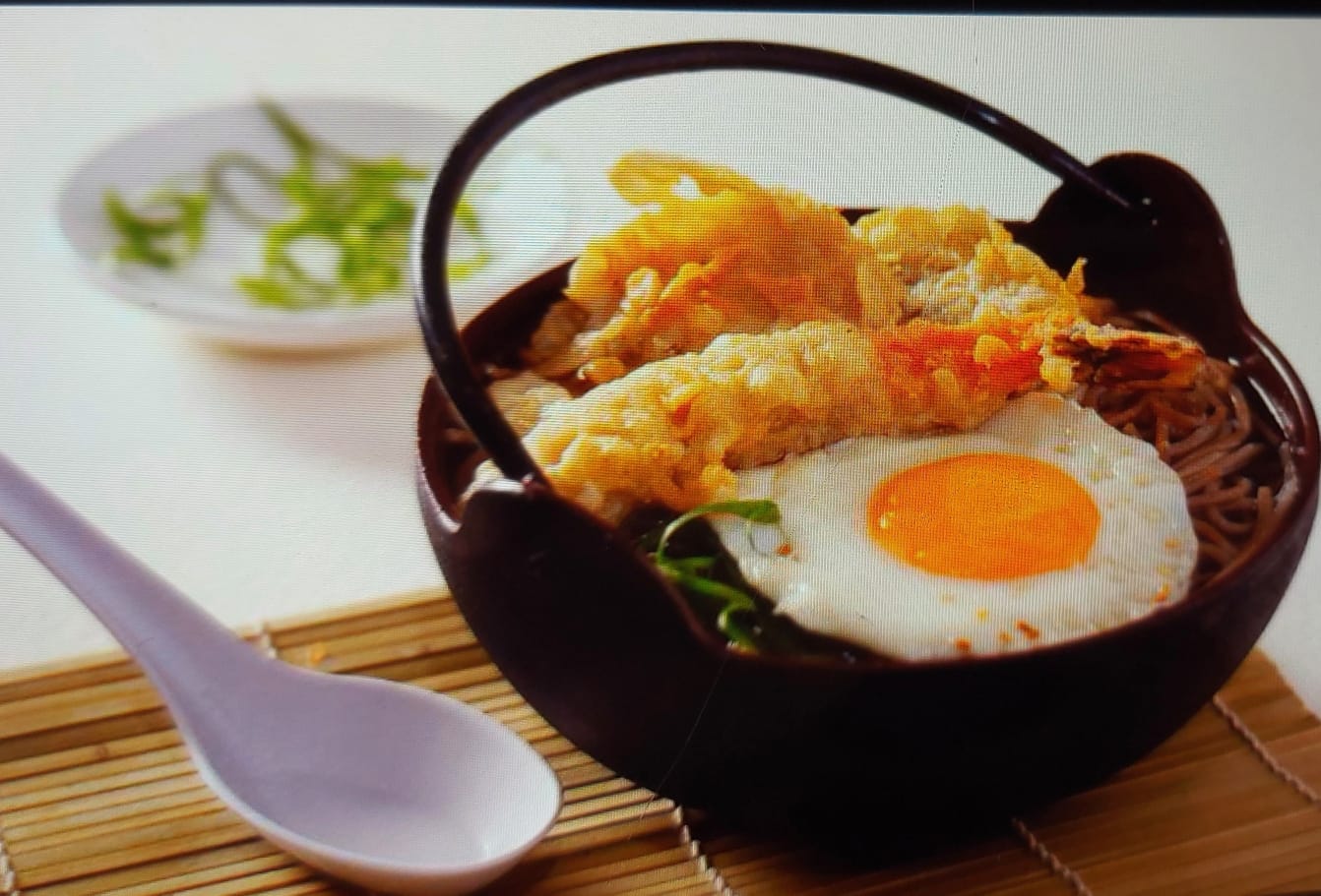 Sopa de fideos con camarón, vegetales, algas, cebollino y huevo.