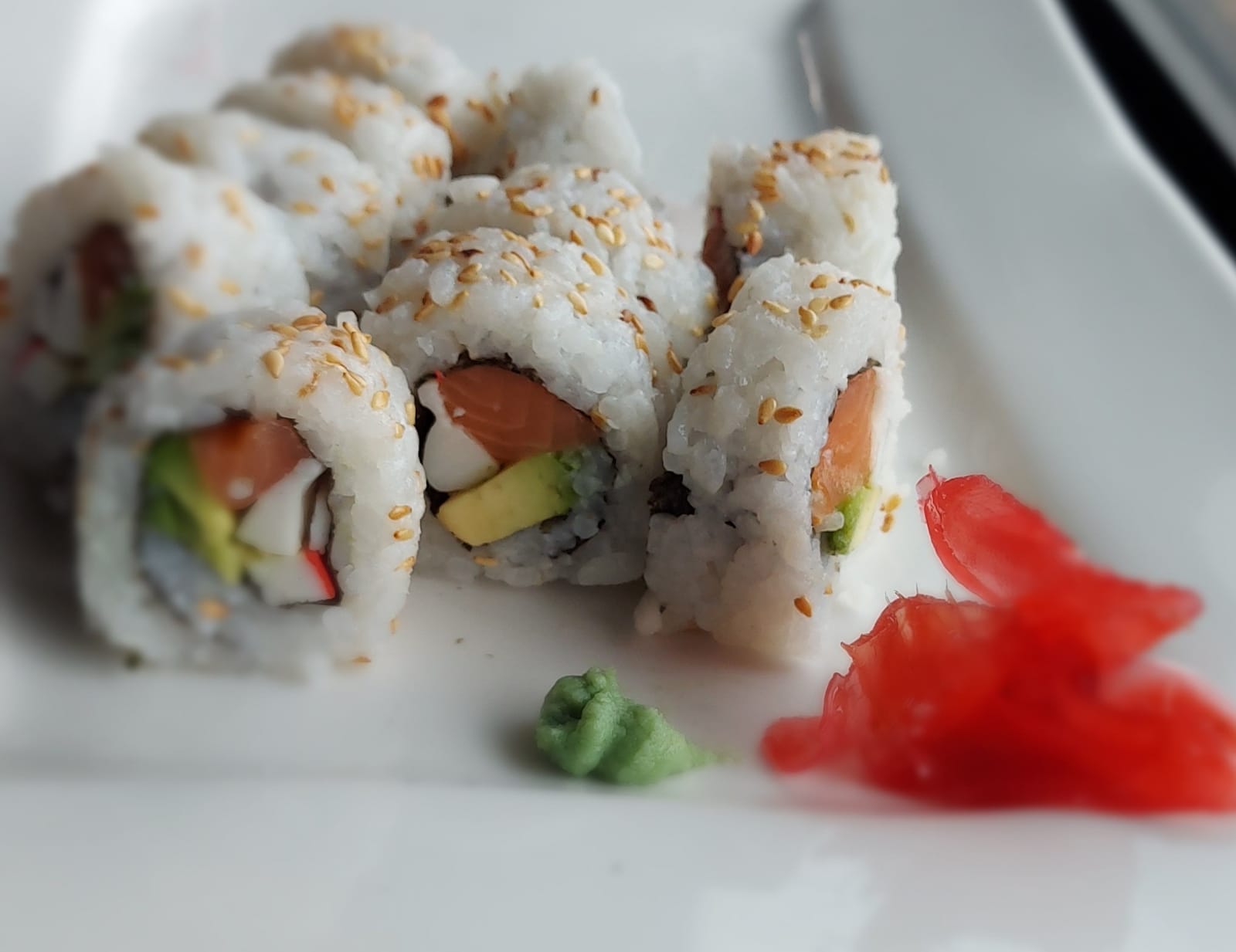 Salmón, queso crema, aguacate y ajonjolí. 10 piezas.