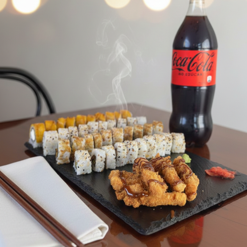 Combo para celebrar 40 piezas: tempura, seiku, carrot y california, acompañado de una bebida 1.5L (sabor a disponibilidad) y nuestro postre Saging Caramelo (plátano empanizado)