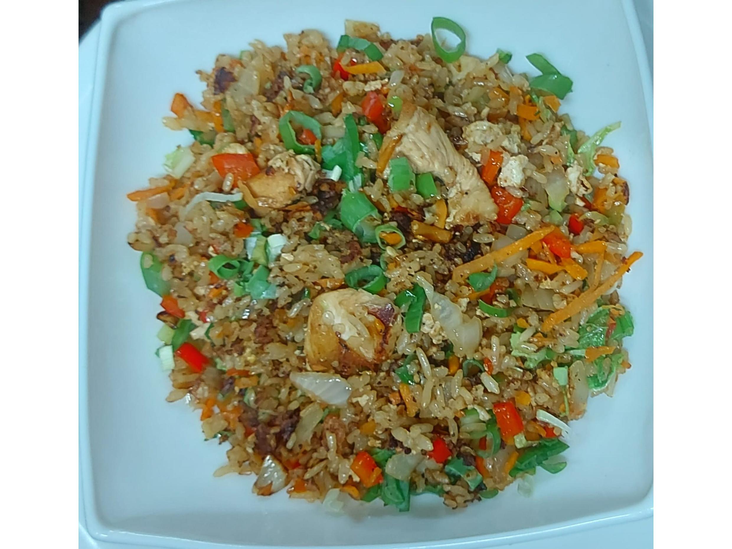Arroz Yakimeshi (arroz con vegetales, pollo y huevo picado)