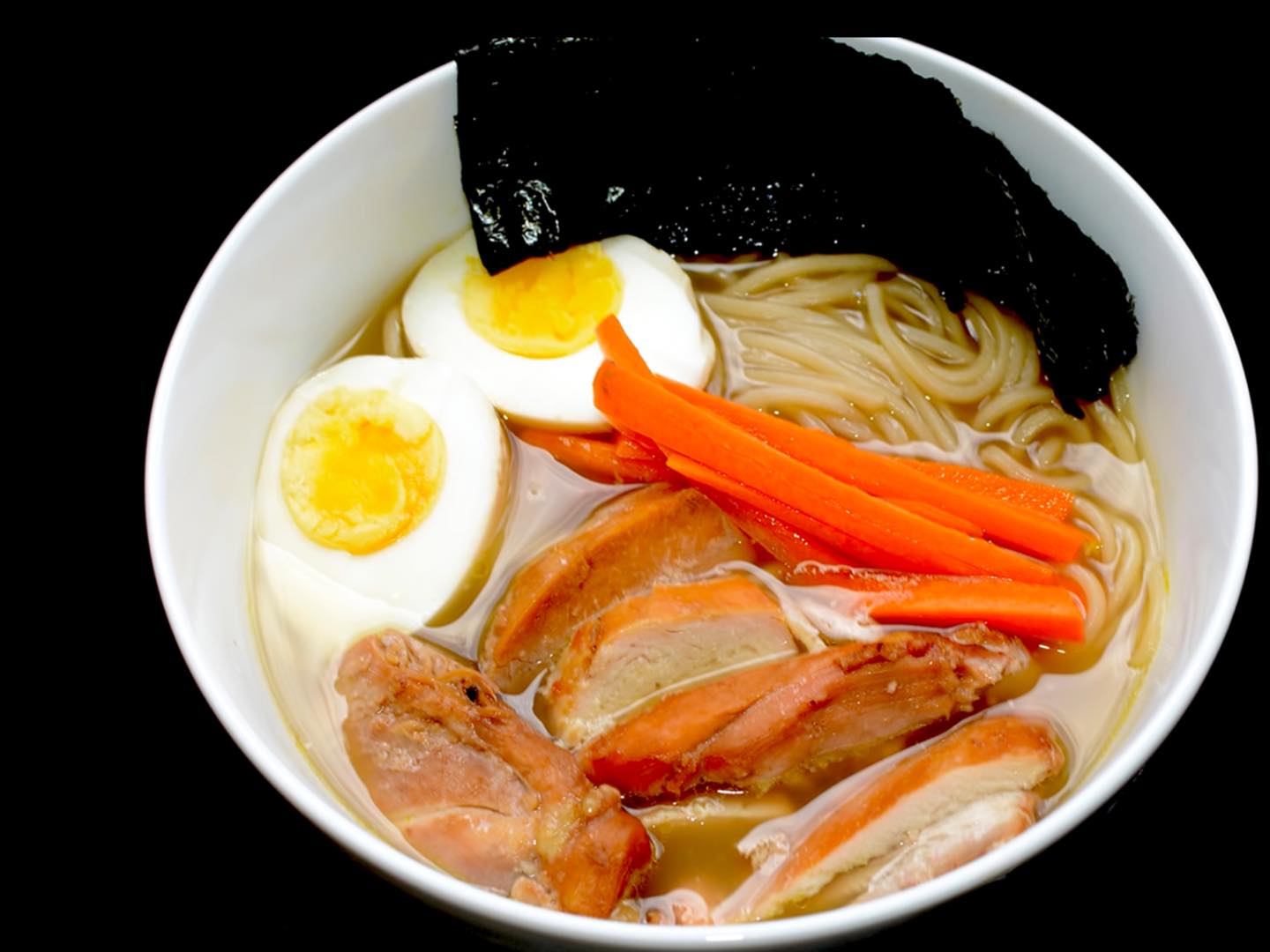 Sopa de pollo con fideos, kamaboku, vegetables y huevo duro.