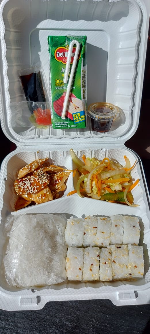 Arroz gohan, sopa miso vegetales salteados, 10 piezas de california. Puede elegir entre Pollo o pescado en salsa de Teriyaki y 1 bebida