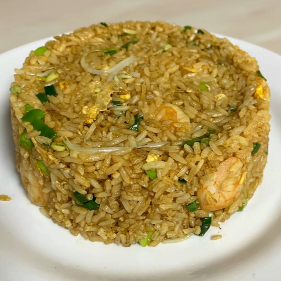 Entero o medio de arroz con camarones y olores (cebollino y cebolla).