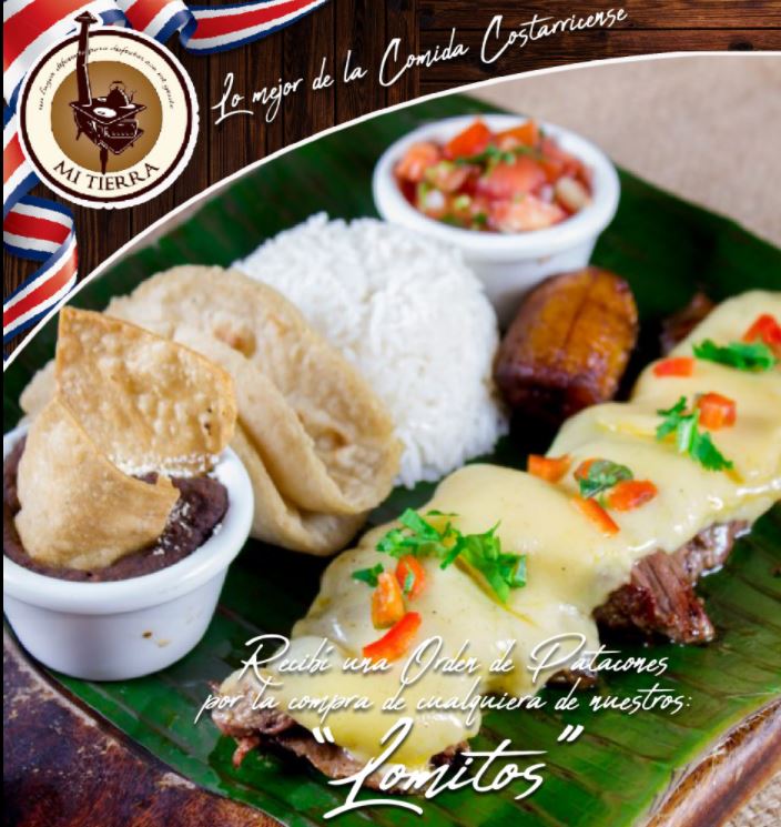 Acompañado con queso fundido, arroz, maduro, frijolitos molidos, pico de gallo y tortillas.