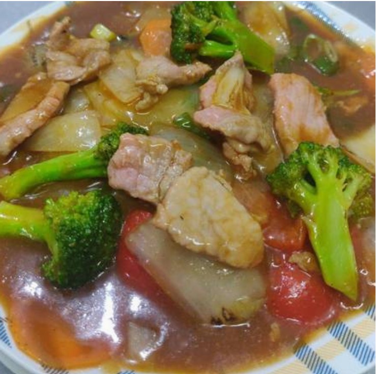 jamon,pollo,lechon y camarones cocinado en salsa china con zanahoria,chayote y brocoli