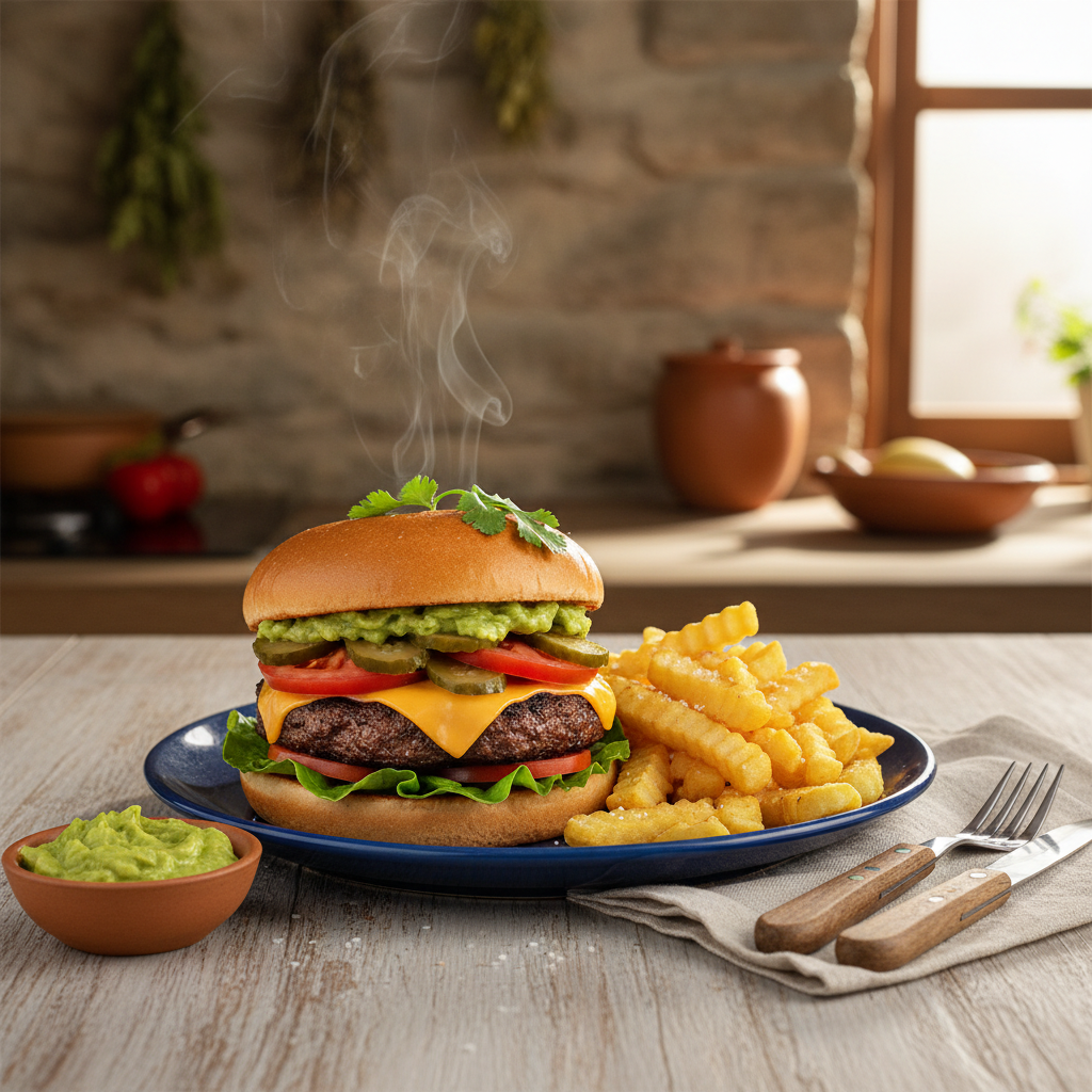 Torta de carne, queso, lechuga, tomate, pepinillos, jalapeños, guacamole acompañado con papas fritas.