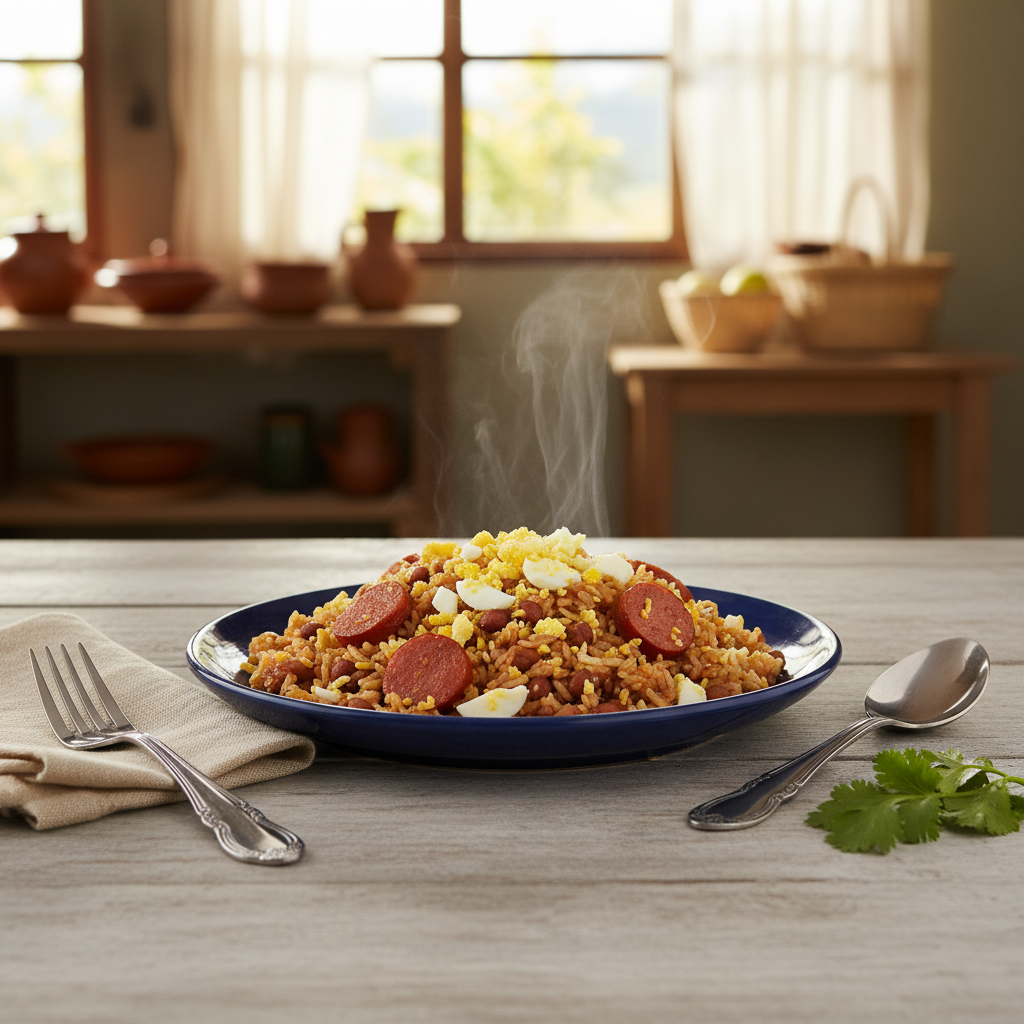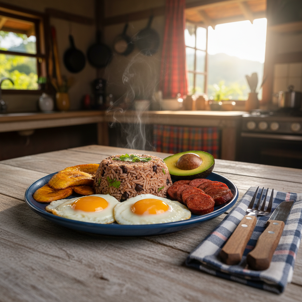 Delicioso gallo pinto con huevo picado y salchichón