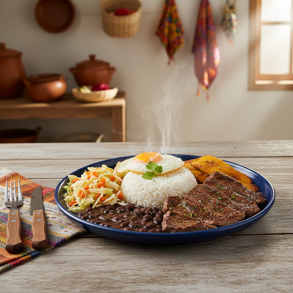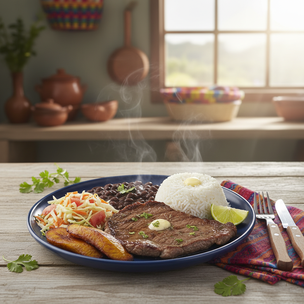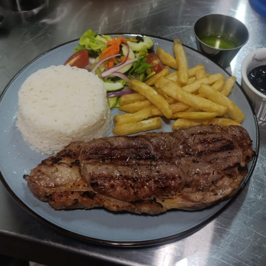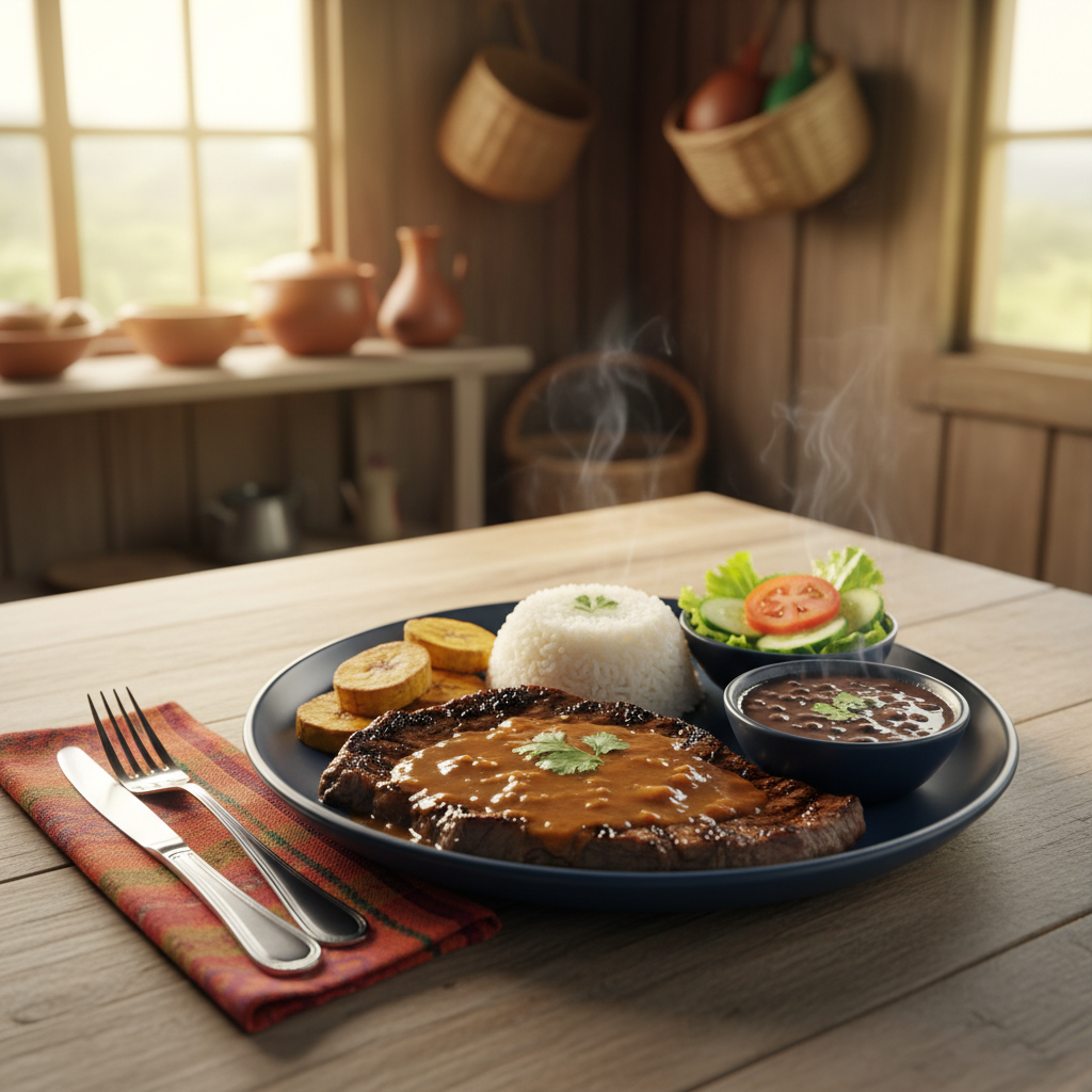 Tradicional plato costarricense con bistec de res, servido con arroz, frijoles y dos guarniciones a elegir.