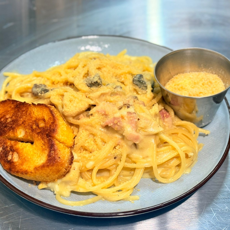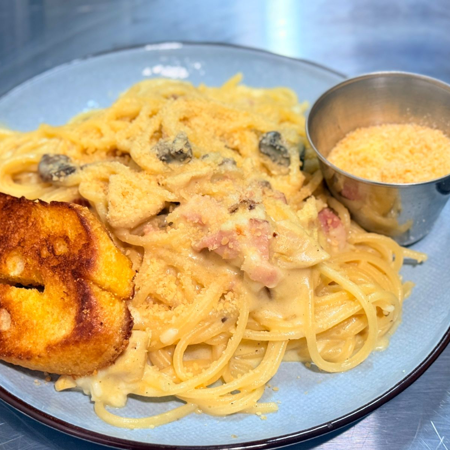 Spaghetti bañado en una salsa blanca con hongos y pollo.