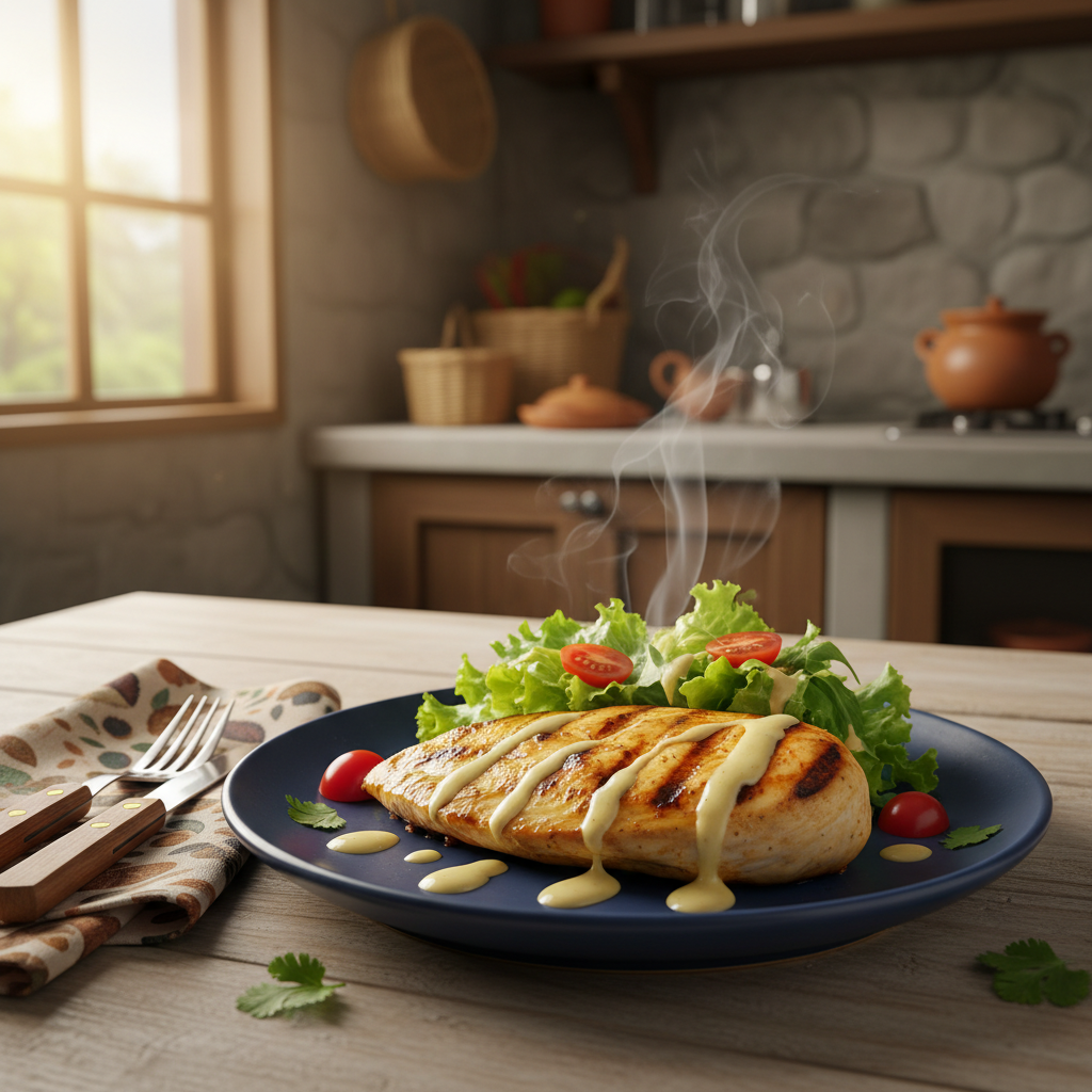 Pechuga de pollo a la plancha con mix de lechugas, tomate cherry y aderezo de la casa.