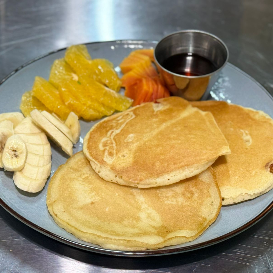 Pancakes acompañados con (banano o fresas) y maple o miel natural.