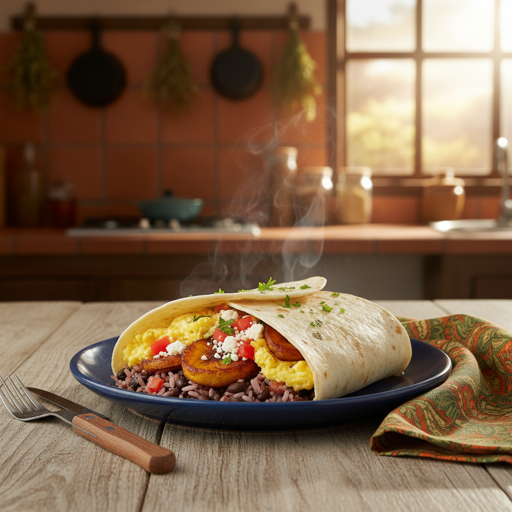 Tortilla de harina con huevo revueltos, gallo pinto, plátano frito, queso y tomate con hierbas italianas.